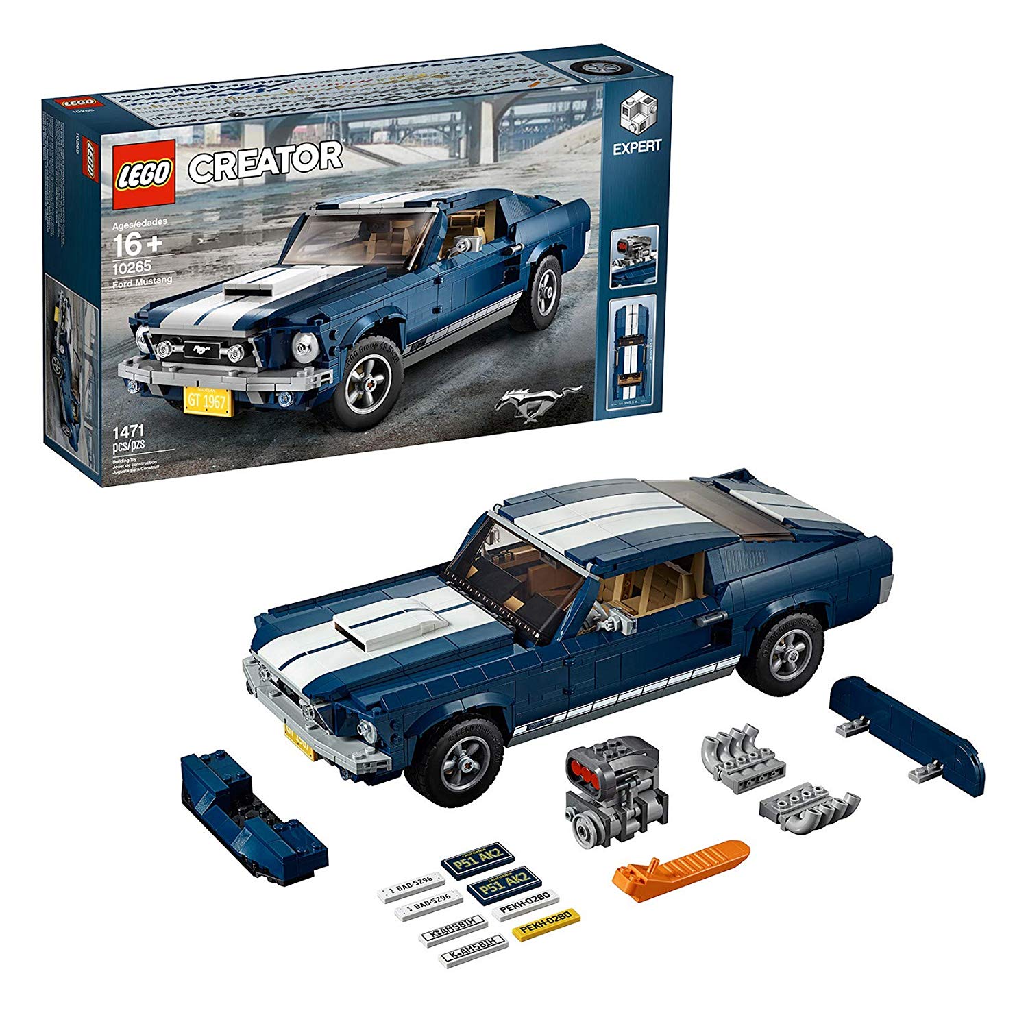Discover the magic of an iconic 1960s American muscle car with the LEGO® Creator Ford Mustang, featuring dark-blue bodywork with white racing stripes, bonnet scoop, printed mustang grille badge, GT emblems and 5-spoke rims with road-gripping tires. Developed with input from Ford, this authentic replica comes with optional add-ons for customization, including a selection of license plates, supercharger, rear ducktail spoiler, beefy exhaust pipes, front chin spoiler and a nitrous oxide tank. You can even adjust the lift of the rear axle for an extra-mean look! Remove the roof panel or open the doors and you have access to the detailed interior with handsome seats, radio, working steering and a mid-console gearshift. Store items in the trunk or lift the hood to reveal a detailed big block 390 V8 engine with battery, hoses and air filter detailing. This advanced building set has been designed to provide a challenging and rewarding building experience full of nostalgia and makes a great centerpiece for the home or office.