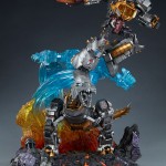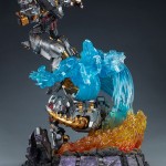 The Grimlock Diorama – Supreme Edition measures 30” tall and 24” wide in a unique display that captures the dual strength of Grimlock’s Dinobot and alternate Autobot form. In this prehistoric scene, the leader of the Dinobots swings his mighty tail in Tyrannosaurus form, opening his jaws wide in a mighty roar. Above him, the warrior Grimlock wields his energo-sword as he leaps into action, converted into a more classic Transformer state. A clear blue element embodies the evolution between designs, giving fans a dynamic look at the fearless fighter in action. Transparent flames frame the prehistoric scene as magma bubbles between charred rocks and Cybertronian ruins on the base.