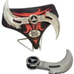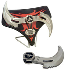 Direct from the motion picture BLADE. United Cutlery brings us this officially licensed. authentic reproduction of “The Glaive of the Daywalker.” Exploding from the pages of Marvel Comics charges Blade – Half Human. Half Vampire – consumed by his never-ending quest to avenge the curse of his birth and save mankind from the vampire plague that threatens all humanity. This magnificent. long-awaited piece was designed directly from the actual studio prop and measures over 10 inches in length when blades are open and locked into position. Every detail has been expertly duplicated to please even the most serious collector. The blade is of polished 420 stainless steel and has a full metal handle. Each Glaive comes with a black enameled wooden display stand that can be shown on a table or mounted to a wall. A metal BLADE logo plate is included.