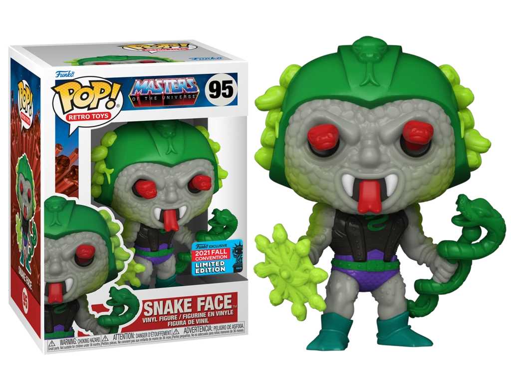 Snake Face has been summoned from another dimension as a 2021 New York Comic Con exclusive Pop! figure to complete your Masters of the Universe collection. Act fast to collect the exclusive Pop! Snake Face before he slithers away. Vinyl figure is approximately 4-inches tall. Please note: Product will come with the 2021 Fall Convention Exclusive sticker on the box.