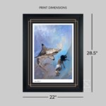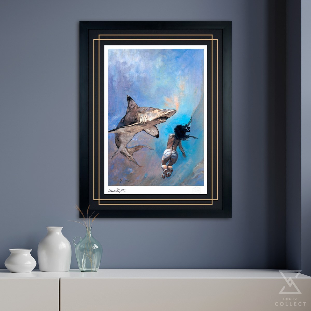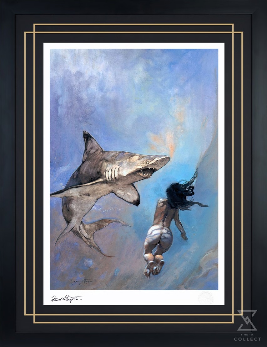 Originally created in 1973 as a promotional image for Doubleday’s Mystery Book Club, this oil painting was revised by Frazetta in the 1980s to its current appearance. This captivating artwork is now available in its final form to collectors as an unframed giclée or in a custom black framed format. Each A Requiem for Sharks Fine Art Print includes a Certificate of Authenticity and features an authorized, hand-stamped signature of Frank Frazetta and the official Frazetta Art Museum embossed Seal of Authenticity as part of the limited edition of 150 pieces. A portion of the proceeds from sales of A Requiem for Sharks will benefit the Frazetta Art Museum’s preservation and exhibition of the artist’s essential works.
