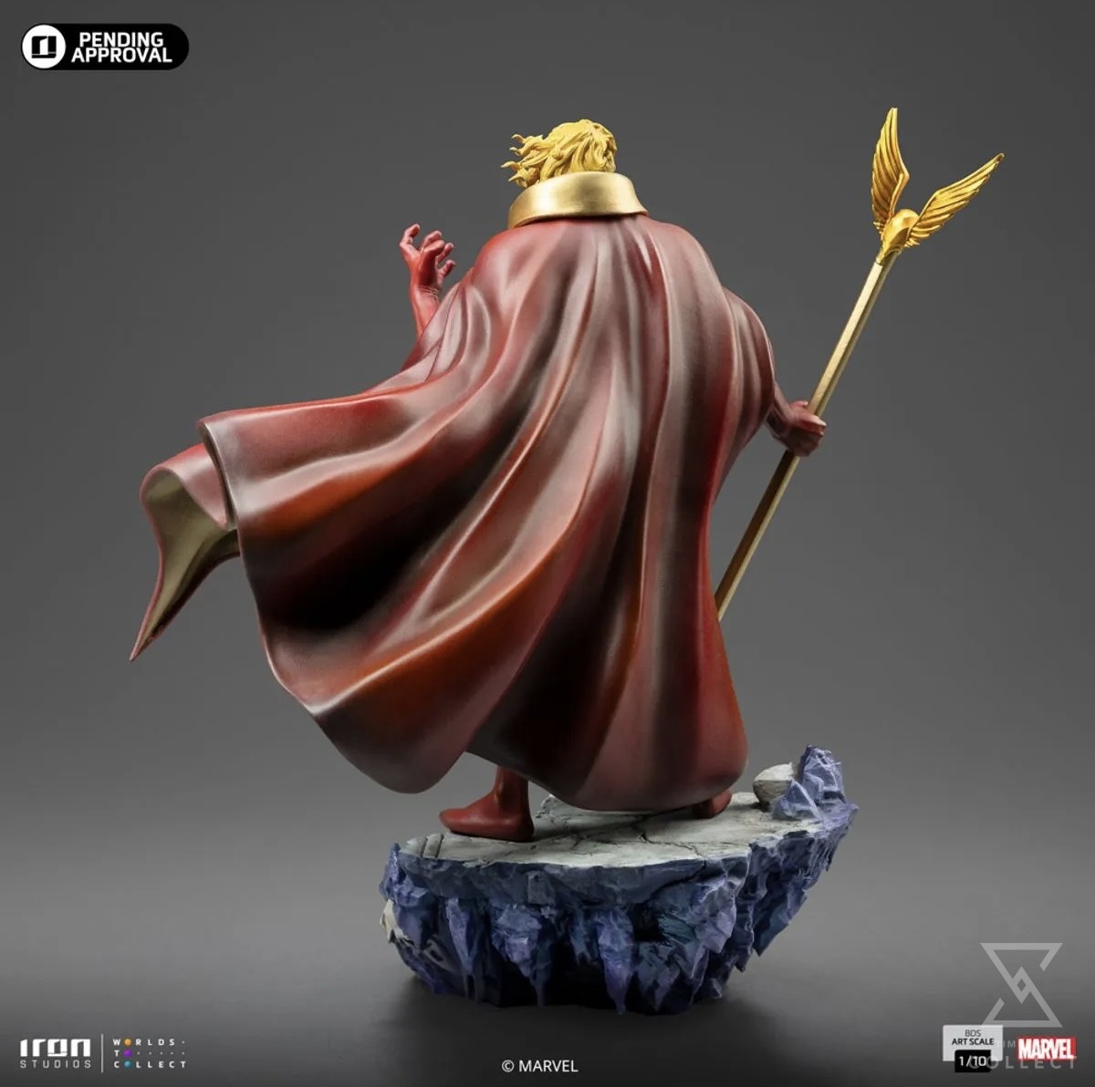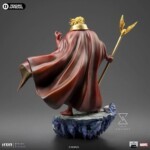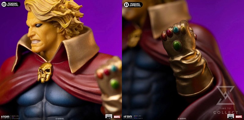 Wielding his Karmic Staff, through which he can channel mystical energies with great precision, the powerful hero with golden skin and hair gestures with his left hand raised and fingers curved, while his long red cape flutters, indicating the direction of cosmic winds. Following the resurrection of his enemy Thanos by Lady Death, when the Mad Titan began collecting the Infinity Stones, the cosmic and mystical golden hero returns to assemble a select group of superheroes to stop him and undo his evil deeds. Standing upon a rocky base composed of fragments from an insane temple created in tribute to the entity of death, Iron Studios presents the statue “Adam Warlock – Infinity Gauntlet – Marvel Comics – Art Scale 1/10”, inspired by the Infinity Saga comic books, where Earth’s mightiest heroes face Thanos and his Infinity Gauntlet. This comic book series inspired the conclusion of Marvel’s Phase 3 in the MCU. The statue features an extra hand wearing the Infinity Gauntlet on his left hand, and an additional head with a furious expression without the Soul Gem on his forehead.
