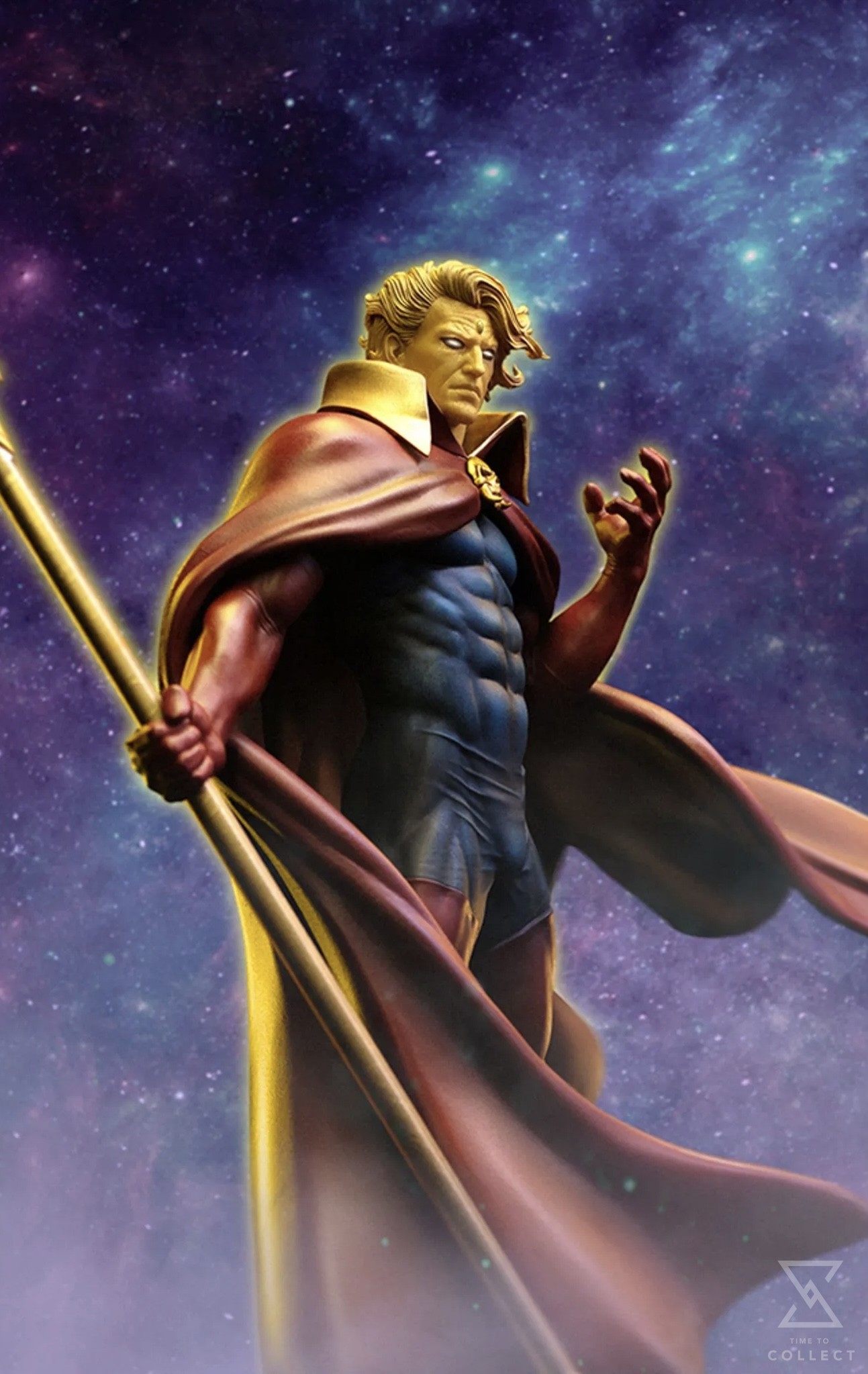 Created in 1967 by Stan Lee and Jack Kirby, Warlock first appeared in the Fantastic Four comic books under the name “Him”, a synthetic human created by the Enclave, a group of renegade occult scientists seeking to accelerate human evolution. He rejected his creators and began wandering the cosmos. Years later, the character was reimagined. Taken in by the High Evolutionary, he was named Adam Warlock and gained a messianic identity as the bearer of the Soul Gem. In new adventures envisioned by writer Jim Starlin, Warlock faced Magus, his evil future self. He fought alongside Thanos, Gamora, Pip the Troll, and ultimately defeated the villain, imprisoning his soul within Warlock’s Gem. Warlock later became the protagonist in the so-called Infinity Trilogy, starting with the epic “Infinity Gauntlet”, the famous saga in which Thanos uses the Gauntlet to wipe out half the universe, influencing Marvel’s cinematic direction. A success with both audiences and critics, this comic book saga defined the rivalry between the Mad Titan and Adam. Warlock possesses numerous superhuman powers derived from his structure, capable of concentrating and manipulating cosmic and mystical energies, describing himself as a Quantum Sorcerer.
