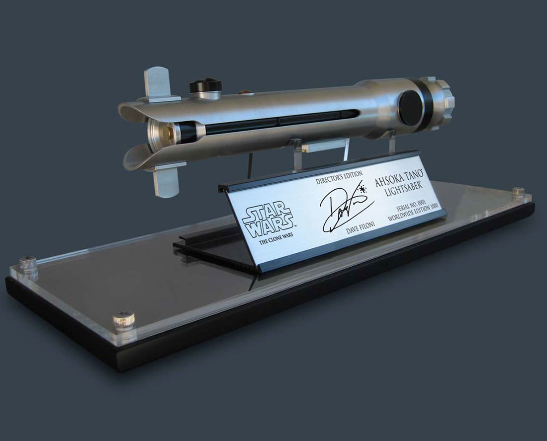 This Ahsoka Tano lightsaber is from the animated series Star Wars:The Clone Wars. The replica is a Director’s Signature Edition with Dave Filoni, the Director of The Clone Wars, and written signature on each and every plaque. As with all Jedi, Ahsoka designed her own lightsaber. You can see the obvious influences in the design of her lightsaber of her Jedi Masters and mentors, including Obi-Wan Kenobi and Anakin Skywalker. Using the original CG files supplied by LucasArts, the lightsaber is an extremely accurate representation. Comes with custom base, plaque, and lightsaber stand. Very limited edition of only 1,000 pieces !