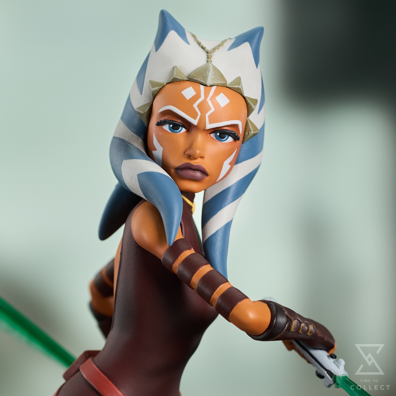 A Gentle Giant LTD release! The Padawan attacks! Ahsoka Tano swings her two lightsabers in front of an explosion as the latest Star Wars Gallery PVC statue! Made of high-quality PVC, this approximately 8-inch statue features interchangeable moving and non-moving lightsaber blades. The perfect companion to the Obi-Wan Gallery Statue, it comes packaged in a full-color window box.