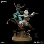 Above the majestic Agrabah palace towers, somewhere in the Middle East of the 9th Century A.D., an amazing flying Magic Carpet crosses floating over the clouds bringing a former street burglar, now a Prince, on his knees behind his beloved Princess with her arms opened. Another memorable classic animation production by Disney Studios is immortalized by Iron Studios in the statue “Aladdin and Jasmine – Disney Classics 100 Years – Art Scale 1/10”, expanding their line of statues celebrating the 100 Years of Disney, with the beloved royal couple in a beautiful set of the One Thousand and One Nights. This special scene was designed to immediately transport the fans to the magic world of Aladdin and the best memories of this iconic production!