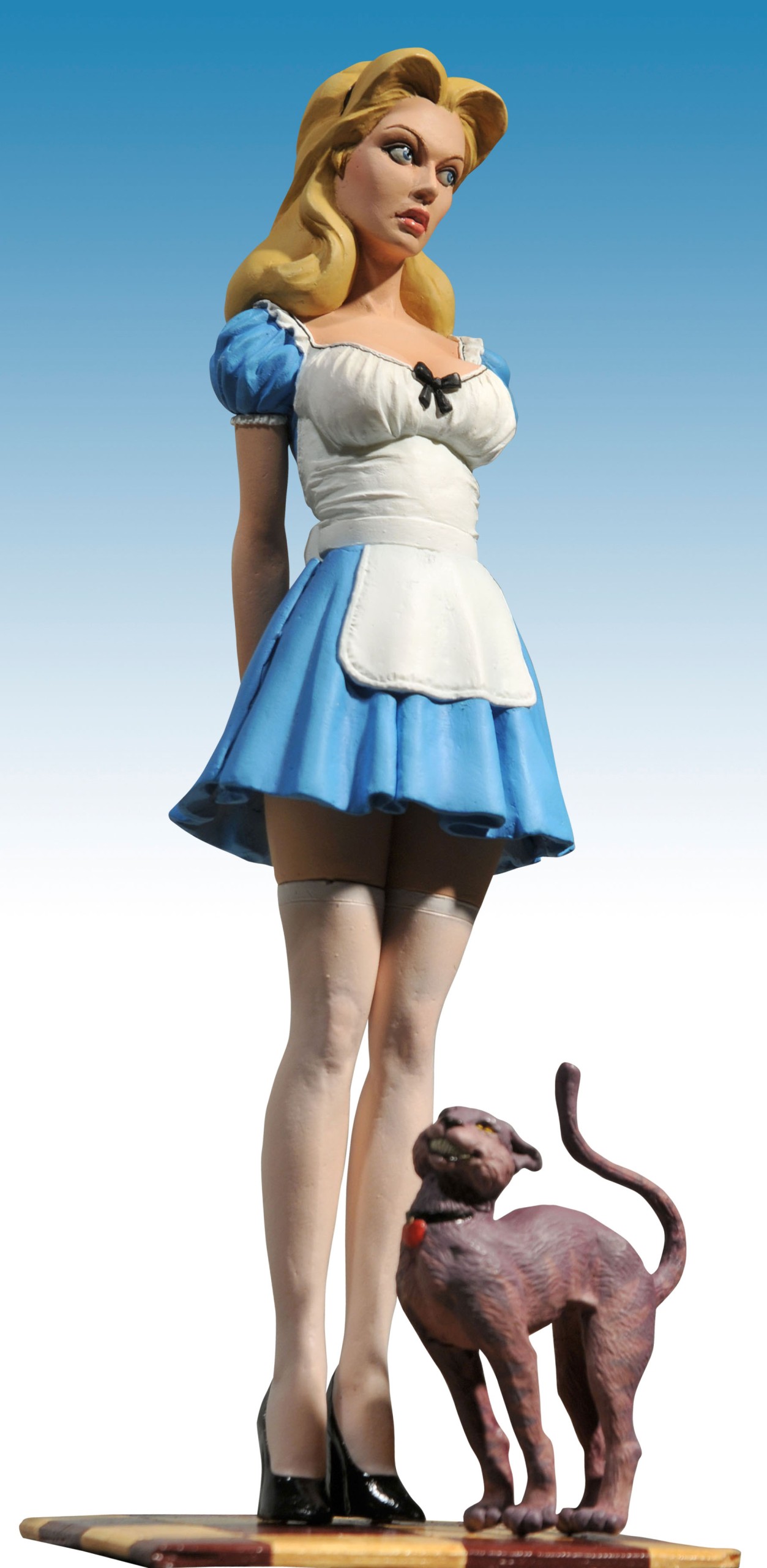 A Diamond Select Release! The “Femme Fatales” figure series offers another interpretation of how young Alice might have looked a decade or so after that first tumble down the rabbit hole! Her dress is a nod to the traditional look we all remember from the stories, but her shy-yet-seductive stance lets us know she may not be as innocent as we believed. And of course, where would Alice be without her trusted friend and Wonderland guide, the Cheshire Cat, by her side? Standing 9″ tall, this Sam Greenwell sculpt showcases the Lewis Carroll heroine in a whole new light.