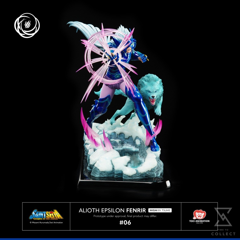 This statue represents Alioth Epsilon Fenrir and his wolf Ging, inspired in particular by the episode « Bared Fangs! The Northern Wolf Fenrir »from the Asgard arc. While Athena prays to Odin, King of Asgard, to prevent the ice from melting, her Saints continue their quest for Odin’s sapphires, as evoked by the snowy bedrock. This is how Shiryu finds himself face to face with Hilda’s envoy: Fenrir, the Epsilon God Warrior, accompanied by his pack of wolves that will not budge! We see here the God Warrior in the service of Odin and Hilda, going on the attack in his varnished midnight blue Cloth reminiscent of the eponymous giant wolf from Norse mythology, the son of Loki, God of Mischief. With his arm outstretched in the Dragon Saint’s direction, Fenrir temporarily blinds him by assaulting him with his searing « Wolf Cruelty Claw » capable of defeating his opponent’s Rozan Shō Ryū Ha!