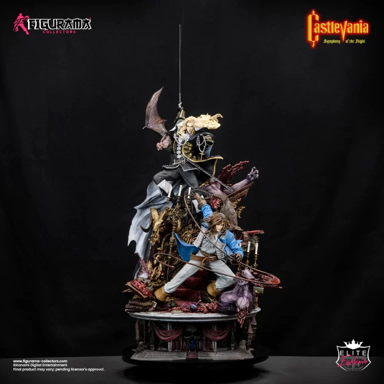 Inspired by Ayami Kojima’s vision of the character, Alucard manifests from a trail of mist, wielding a holy rosary in one hand and his blade in the other as he cuts down the undead enemies lurking the library’s halls. A vampire bat soars from Alucard’s billowing cloak while a wolf’s head adorns the base behind him, representing the dhampir’s animal transformations. Beneath Alucard’s levitating form, Richter Belmont cracks the famed whip, Vampire Killer, against a skull-headed Spellbook and Lesser Demon. The golden, gothic splendor of the library’s furnishings feature layers of intricate paintwork and authentic, gilded details. Hiding in the wreckage of the battlefield, countless relics surround the crimson-carpeted stairway—a vial of Holy Water, ornate candelabras, over two dozen ancient volumes, a discarded blade, and a ceremonial Stone Mask. Cast in shadow, the silhouette of the statue invokes a similar shape to Dracula’s Castle, with Alucard’s upheld sword, the bat’s wing, and the monster’s arms serving as allusions of its towers and spires. © Konami Digital Entertainment