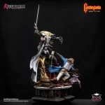 Figurama Collectors proudly unveils its most detailed statue to date and first ever inspired by a video game series—the genre-defining Castlevania: Symphony of the Night. Alucard & Richter Belmont Elite Exclusive Statue makes history as the world’s first resin statue to depict both characters. Set in the Long Library, the dramatic scene unfolds over a miniature replica of the stage that started it all—Dracula’s Throne Room. Complete with blood-red banners and skull-shaped backdrop, the base also features several inverted turrets, parapets, and stone walls, symbolizing the iconic ending of the game where Alucard must navigate the upside-down castle.