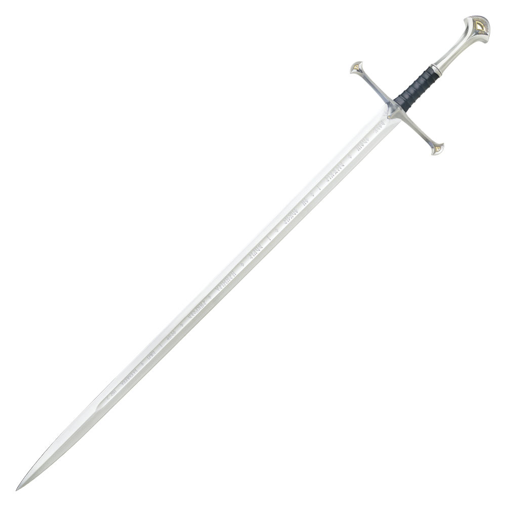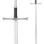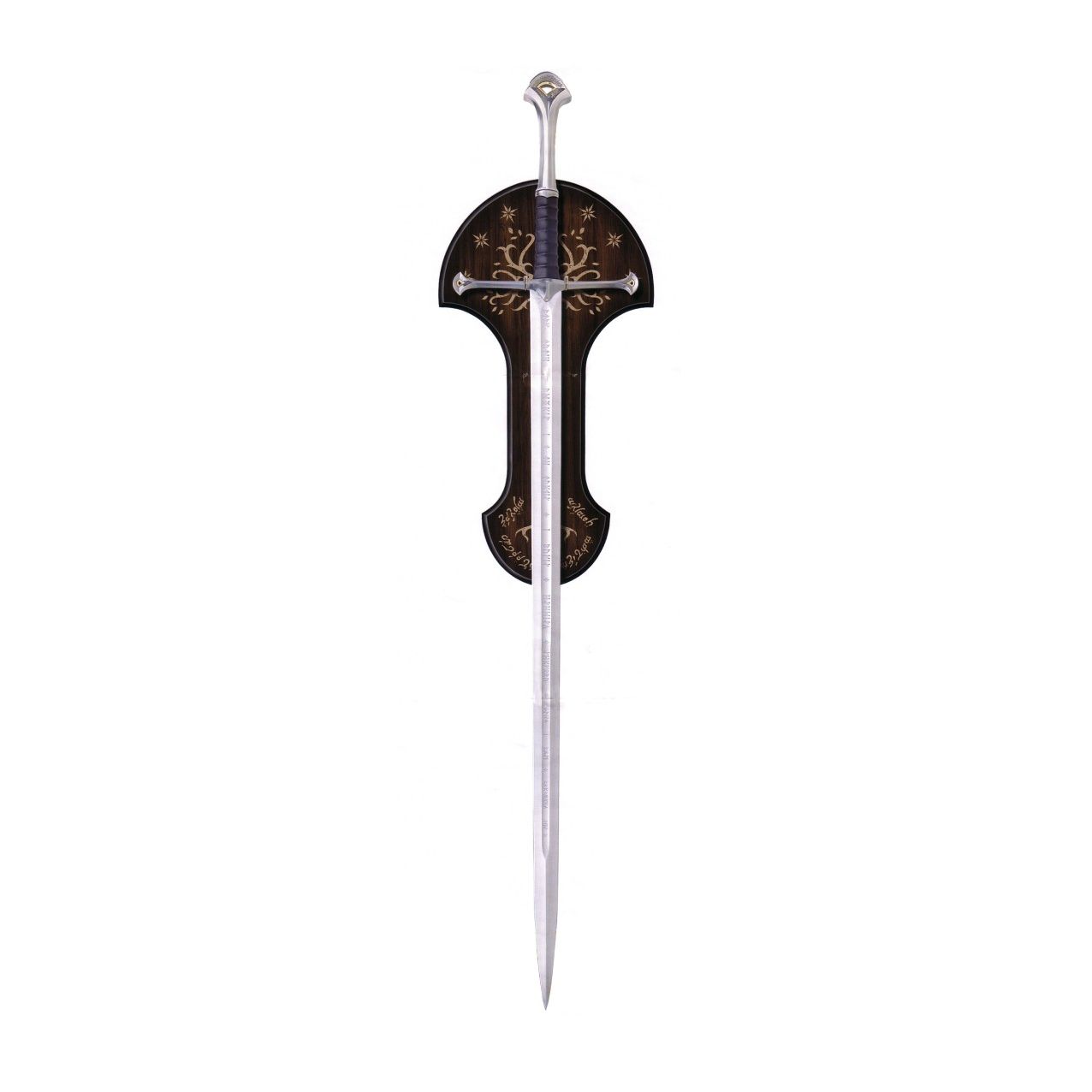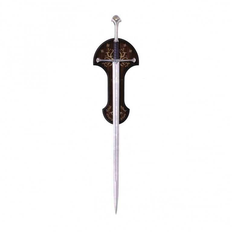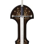 The classic epic tale considered by millions to be the greatest fantasy-adventure story ever told. JRR Tolkien’s phenomenal epic trilogy chronicles the struggle between good and evil for possession of a magical ring. The book trilogy, named the most popular book of the 20th century, has been presented in a series of feature films from New Line Cinema. Solid metal cross guard and pommel, antique silver plated finish. 24K gold plated fittings. Leather wrapped grip. 420 stainless steel blade. Authentic runes deep-etched on both sides of the false-edged blade. Wooden display plaque. Certificate of authenticity. 52.625″ overall. 40.625″ blade.