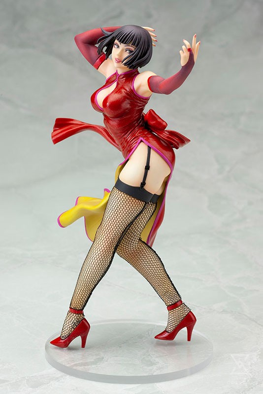 The alluring Anna stands ready to take on any challenger in a powerful and dynamic pose. The beautiful lady in red wears a stunning crimson dress slit to her hip with a bow at the back; the fighter stands in a strong breeze as the dress flows and billows around her, revealing a bright yellow reverse side. Anna is captured in a unique stance, a slight crouch with her upper legs together and lower legs scissored forward and back while she twists to the side at her waist to beckon you closer. The voluptuous hapkido expert accessorizes her dress with matching red heels and unattached sleeves plus sexy thigh high black stockings. Incredible detail has gone into every inch of this presentation, capturing all of the subtle clothing elements and movement down to the sweep of her short hair framing her beautiful Bishoujo styled face!