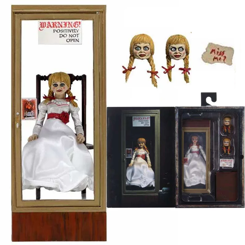 The possessed doll Annabelle appears throughout The Conjuring Universe films and in her own spin-off movies. The fully posable figure stands approximately 6” inches tall (7” scale) and replicates the doll’s appearance in Annabelle Comes Home. It features a soft goods skirt and comes with interchangeable heads, her chair and museum doll case accessories.