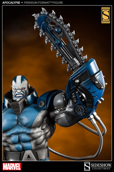 One of the first mutants and longtime adversary of the X-Men, Apocalypse is presented in his ghastly blue and grey color combination and prominent ‘A’ belt. The merciless bio-mechanical supervillain glowers down at all unworthy opponents, using his psionic shape-shifting abilities to wield a massive plasma laser cannon above his head, or with the additional Sideshow Exclusive accessory, a tremendous bladed saw arm. Towering over two feet tall on an intricate machine base, the awe-inspiring conqueror brings “growth, judgment, and destruction” as he takes one step closer to world domination.