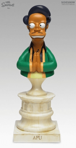 Sideshow The Simpsons Apu Nahasapeemapetilon Polystone Bust features a classic, fluted, faux marble column along with Apu emblazoned on the front. The bottom of the pedestal features the Simpsons logo, character name, edition size and sculptor’s signature.