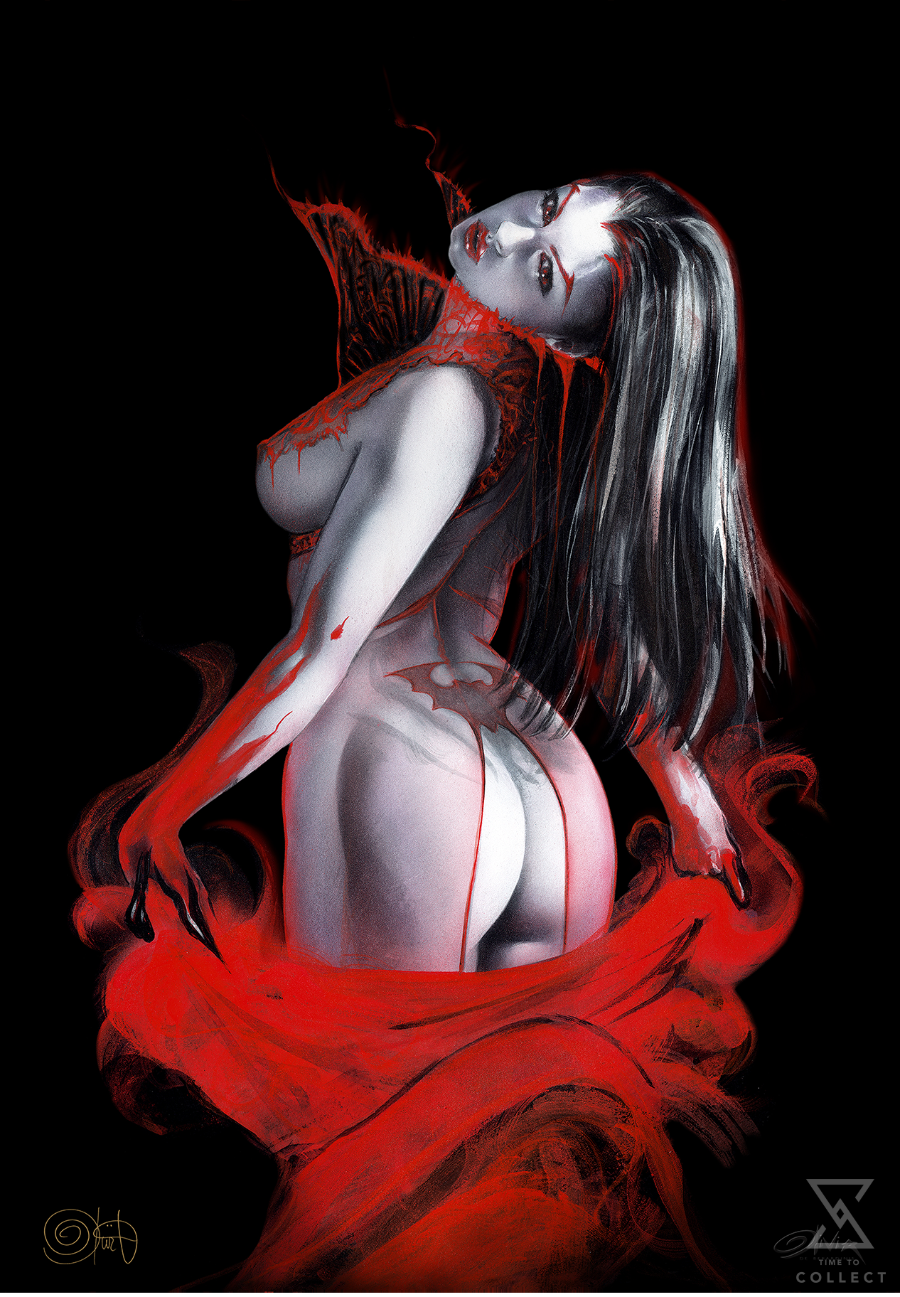 In this dazzling original portrait by Olivia, model Aria Giovanni is transformed into an irresistible vampire wrapped in blood and lace. Shining ghostly pale against a background of pure darkness, Aria lures the viewer into her dangerous presence. Red mists swirl and delicate designs trail over her arms and chest, blending into sanguine strands dripping off her body. Her hypnotic gaze is as eternal as her beauty — would you let this vampire take a bite?