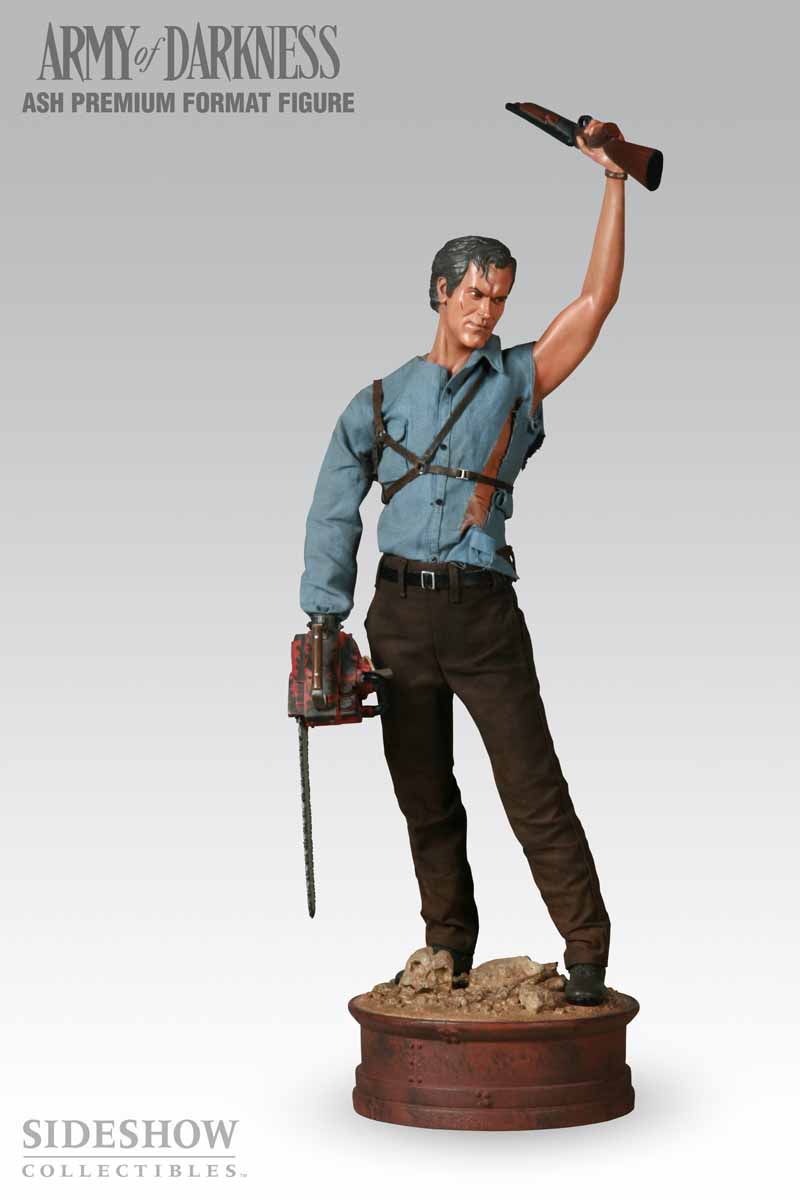 The Premium Format Ash Figure captures Bruce Campbell in a signature pose, standing with his boomstick raised above his head and chainsaw-hand at the ready. The figure is cast in high-quality polystone, and dressed in real fabric clothing, complete with his chest rig & holster. Ash stands over 20″ tall atop a detailed display base, complete with Deadite debris, and is sure to be the centerpiece of your Army of Darkness collection.