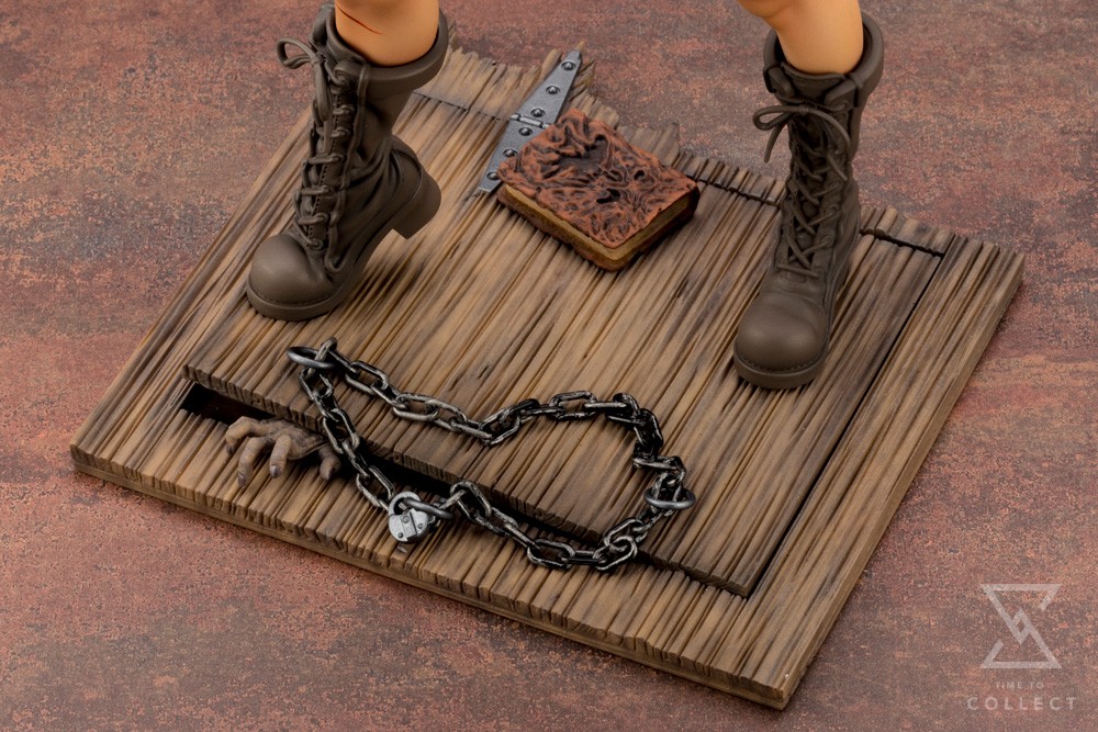 A KOTOBUKIYA Japanese import! Kotobukiya’s elite Bishoujo Statue line has brought you beautiful characters from all manner of anime series, DC and Marvel comics, Star Wars, video games, and much more. Recently the series took a totally unique turn, transforming horror movie icons into pretty girls with Jason Voorhees, Freddy Krueger, and Edward Scissorhands. Up next in this innovative gender-bending series is one of the most iconic characters from one of the most famous cult horror movies of all time, Evil Dead 2: Dead By Dawn Ash Williams! Sam Raimi’s 1987 sequel brought back the indomitable Ash (played by superstar Bruce Campbell), a young man who just wants to have fun in a cabin in the woods but who is forced to put down an ancient evil invading his friends… and his own body parts. Now that reluctant hero’s appearance is expertly translated into the Bishoujo style by series illustrator Shunya Yamashita! Reflecting the violent nature of the film, Ash’s clothes are tattered and torn to reveal her impressive physique as she strikes a saucy pose. She stands on an exquisitely detailed base modeled after the floor of the cabin from the film, complete with a decomposing hand peeking out from the cellar door. The Necronomicon Ex-Mortis, the cause of all the trouble, is a separate piece allowing you to display it wherever you like. Sculpted by Takaboku Busujima (BUSUJIMAX), Ash Williams stands over 10 ½ inches tall (1/7 scale). The contrast between the bold, chainsaw-wielding hero and the intricate details in the craftsmanship make this Bishoujo one you won’t want to miss!