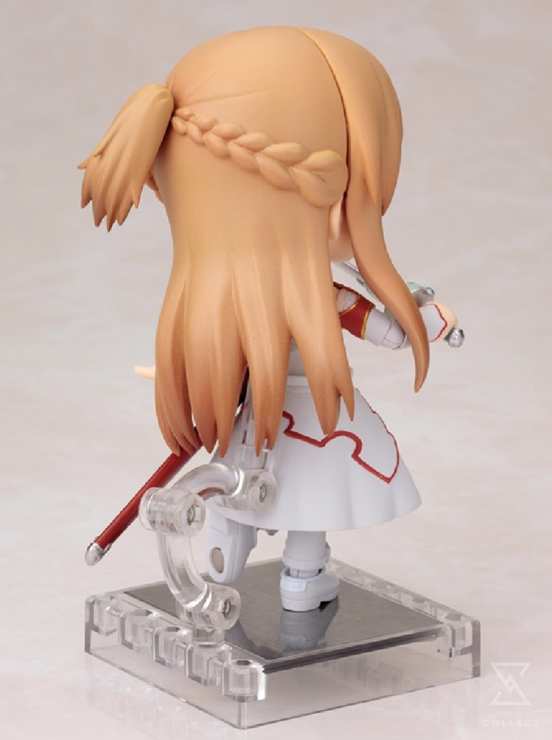 A Kotobukiya Japanese import! Kotobukiya’s lineup of cute and highly articulated Cu-Poche figures continues to expand with the addition of Sword Art Online and its main female protagonist Asuna! A member (and sub-leader) of the Knights of the Blood Oath clan, the in-game avatar of Yuuki Asuna makes for an adorable little figure featuring detailed styling and magnets in her feet for extra stability on the included display base. The fierce fighter wears her clan’s white and red “armor,” a beautiful outfit highlighted by its blood red skirt, white top with long trailing coat, and tiny red crosses decorating the ensemble. As with all of the Cu-Poche figures you can customize Asuna’s display with multiple included accessories like her sword (sheathed and unsheathed), and alternate parts give her a range of facial expressions! Sculpted by Naoki Nishimura, the pretty avatar stands just under 4 ½ inches tall and has excellent articulation for a high degree of poseability. Display Asuna on her own or with other Cu-Poche figures from Kotobukiya!