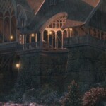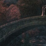 This officially licensed Lord of the Rings artwork depicts Arwen Evenstar and Aragorn standing together on upon a bridge amidst the solace and beauty of Rivendell. Arwen, with her luminous beauty, ethereal grace, and hauntingly deep eyes, exudes an aura of timeless elegance. Aragorn, rugged yet regal, emanates the quiet strength of a king in exile. His weathered features and piercing gaze tell tales of trials faced and hope rekindled. Together, the couple are a powerful testament to the resilience of love against the tide of fate. Their bond is a luminous thread woven through the fabric of their troubled world, guiding them towards a future where Light might once again prevail.