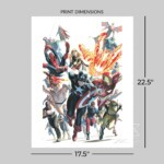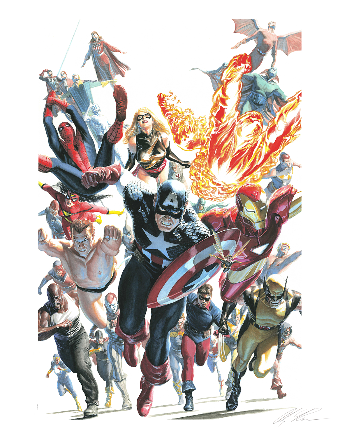 Invaders & Avengers Unite! Originally created as a cover for Avengers / Invaders #12, this dynamic illustration features a magnificent supergroup of members from each team, including Captain America, Bucky, Wolverine, Sub Mariner, Iron Man, Luke Cage, Human Torch, Toro, Spider-Man, Spider-Woman, Ms. Marvel, Wasp, Red Raven, Angel, Defender, Black Marvel, Blue Diamond, Patriot, Miss America, Jack Frost, Citizen V, Destroyer, Thunderer, Dynaman, and Iron Fist.