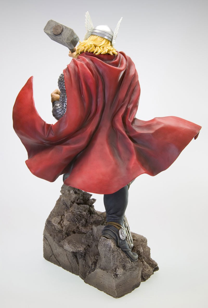 A KOTOBUKIYA Japanese import! In 1962 comic book mastermind Stan Lee set out to create a new superhero, one who was incredibly powerful. He found such a character in Norse mythology, the god of thunder THOR. A true champion of good, Thor has fought beside many other Marvel Comics superheroes throughout the years, including several incarnations of the Avengers. The thunder god is the first in the all-new Avengers Reborn series, and will be joined by both Captain America and Iron Man! The mighty Norse god has never before appeared so powerful and dominating, bringing to life the current version of Thor. The warrior god stands in the midst of battle, swinging the hammer Mjollnir against the foes of Asgard. Thor‘s armor is intricately sculpted over his powerful physique, while his great cloak billows out behind him. The resplendent colors of the godfs outfit shine, with the red and blue offset by the gleaming silver of his armor. The herofs intense expression and dynamic pose clearly shows his power and battle prowess!