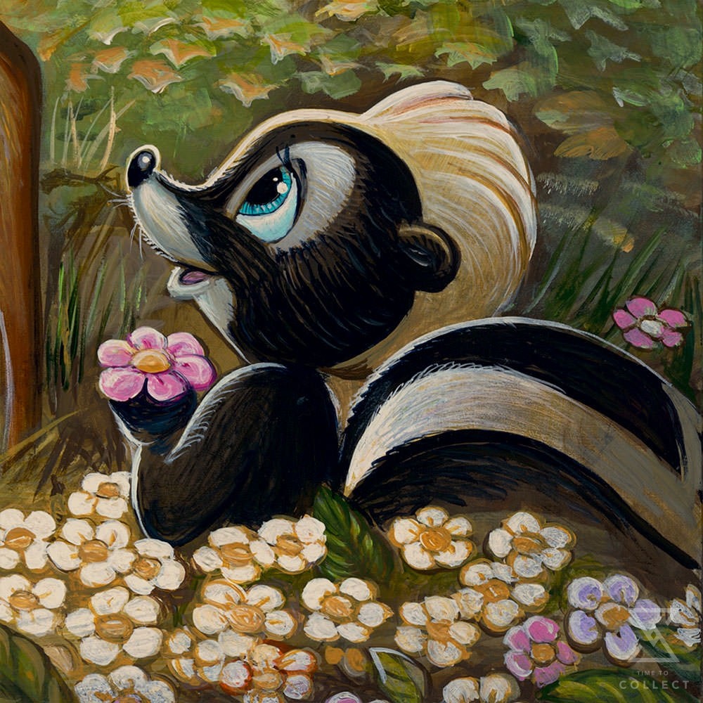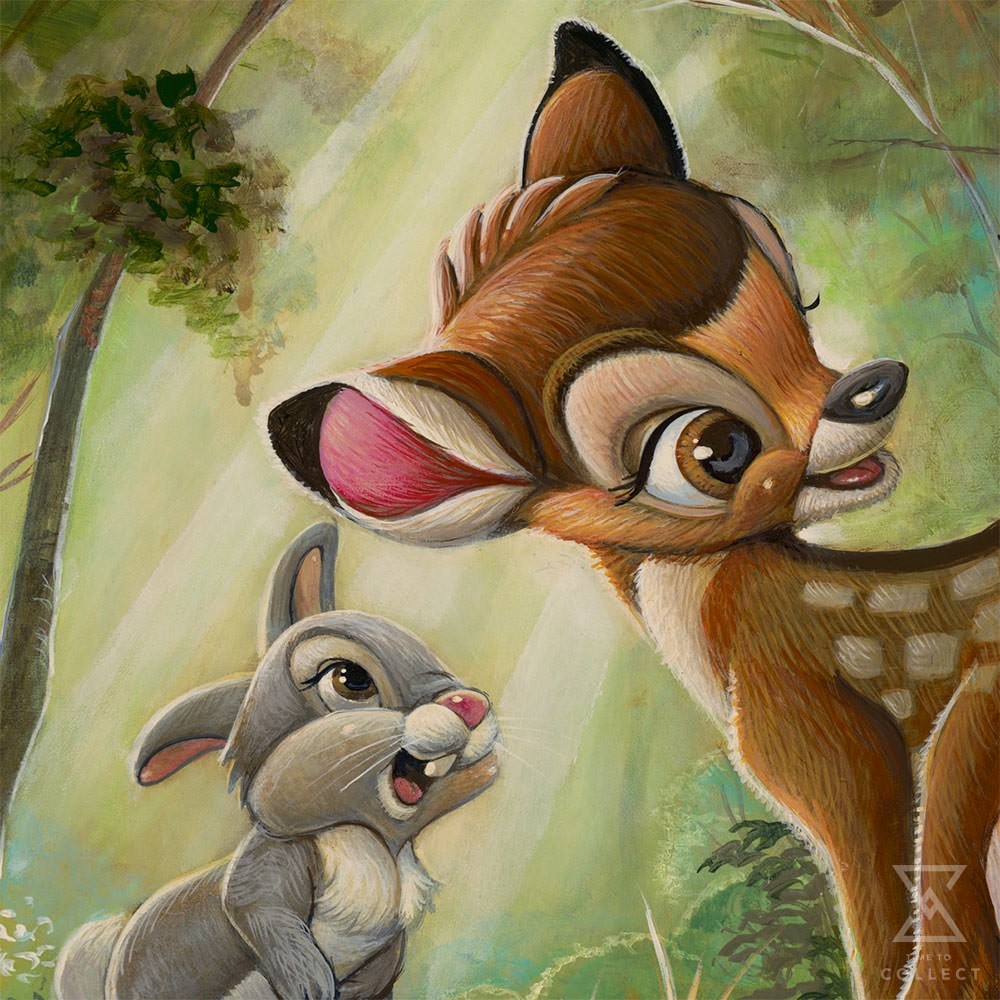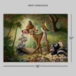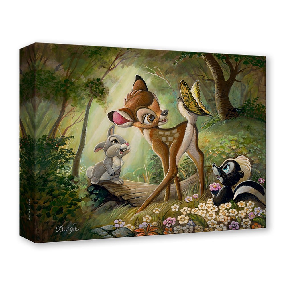 Young Bambi meets friendly woodland critters Thumper, Flower, and a sweetly curious butterfly in this Disney fine art print inspired by the 1942 animated classic Bambi. Each ready-to-hang gallery-wrapped canvas art print is part of Disney Fine Art’s ‘Treasures on Canvas’ collection, and includes a Certificate of Authenticity from a limited edition of 1500 pieces.