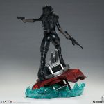 The Baroness features an entirely sculpted costume inspired by her classic animated appearance. Her sleek black catsuit, boots, and grey gloves have dynamic textures that mimic the movement of real fabric, along with grey piping accents for detail. Her determined portrait includes her famous black-rimmed glasses, while red lipstick and the Cobra logo on her chest add a pop of color to her dark look. The Baroness is armed with a pistol and rifle, making this femme fatale a dangerous beauty to behold.