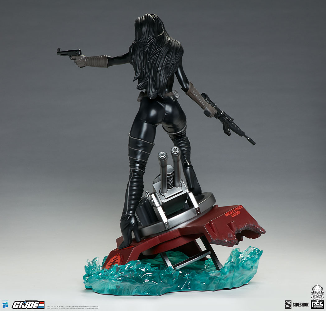 The Baroness Statue measures 22” tall as the ruthless lieutenant straddles the turret cannon of the Moray while it sinks beneath the water. Blue translucent waves churn against the red hydrofoil as Baroness stands her ground, waiting for extraction from the battle against G.I. Joe.
