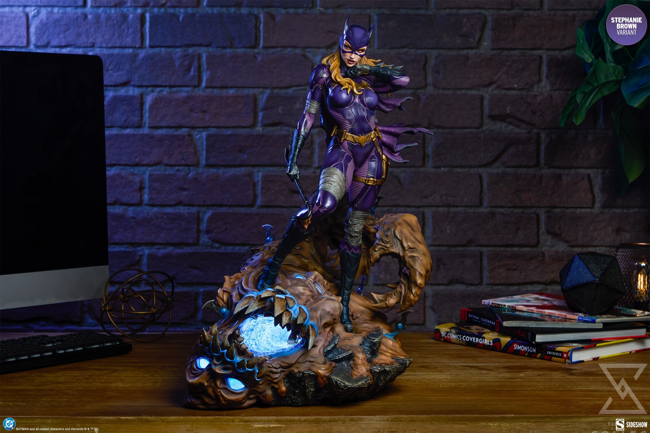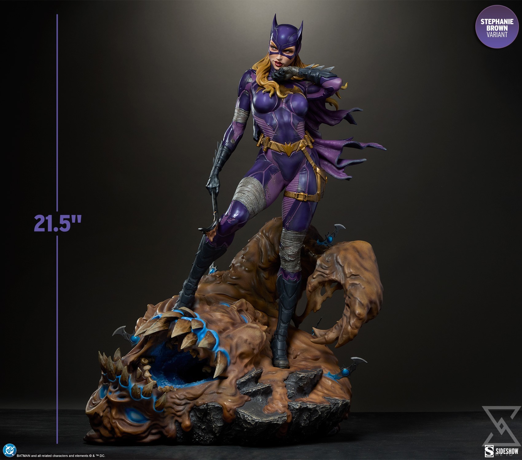 The polystone Batgirl (Stephanie Brown Variant) Premium Format™ Figure measures 21.5” tall x 15” wide x 14” deep. Inspired by the characters’ comic book appearances, this collectible is fully sculpted to capture everything from her costume details down to the varied textures of Clayface’s body. Cloth-like bandages wrap Batgirl’s arms and legs, while her tactical purple Batsuit is accented with armored gold elements like her gauntlets, boots, and utility belt. Her outfit is weathered to reflect the perils of crimefighting in Gotham City, and a tattered cape flutters off her shoulder. Below her, Clayface alternates between melting, muddy ooze and dried, cracked dirt where the Batarangs have zapped him.