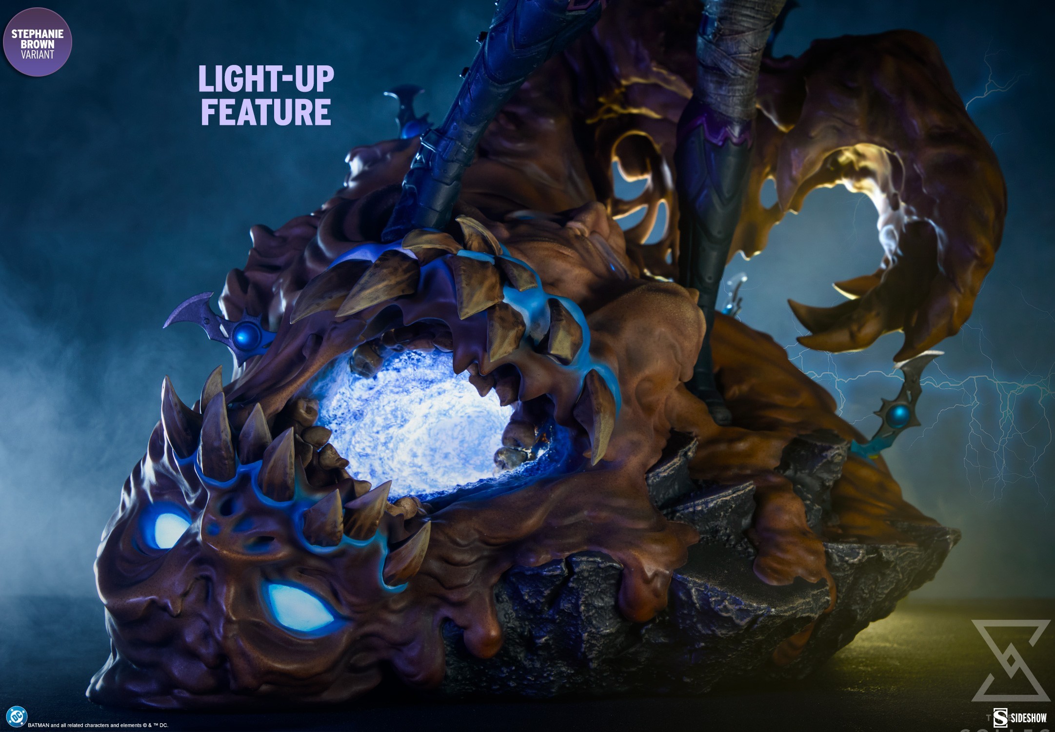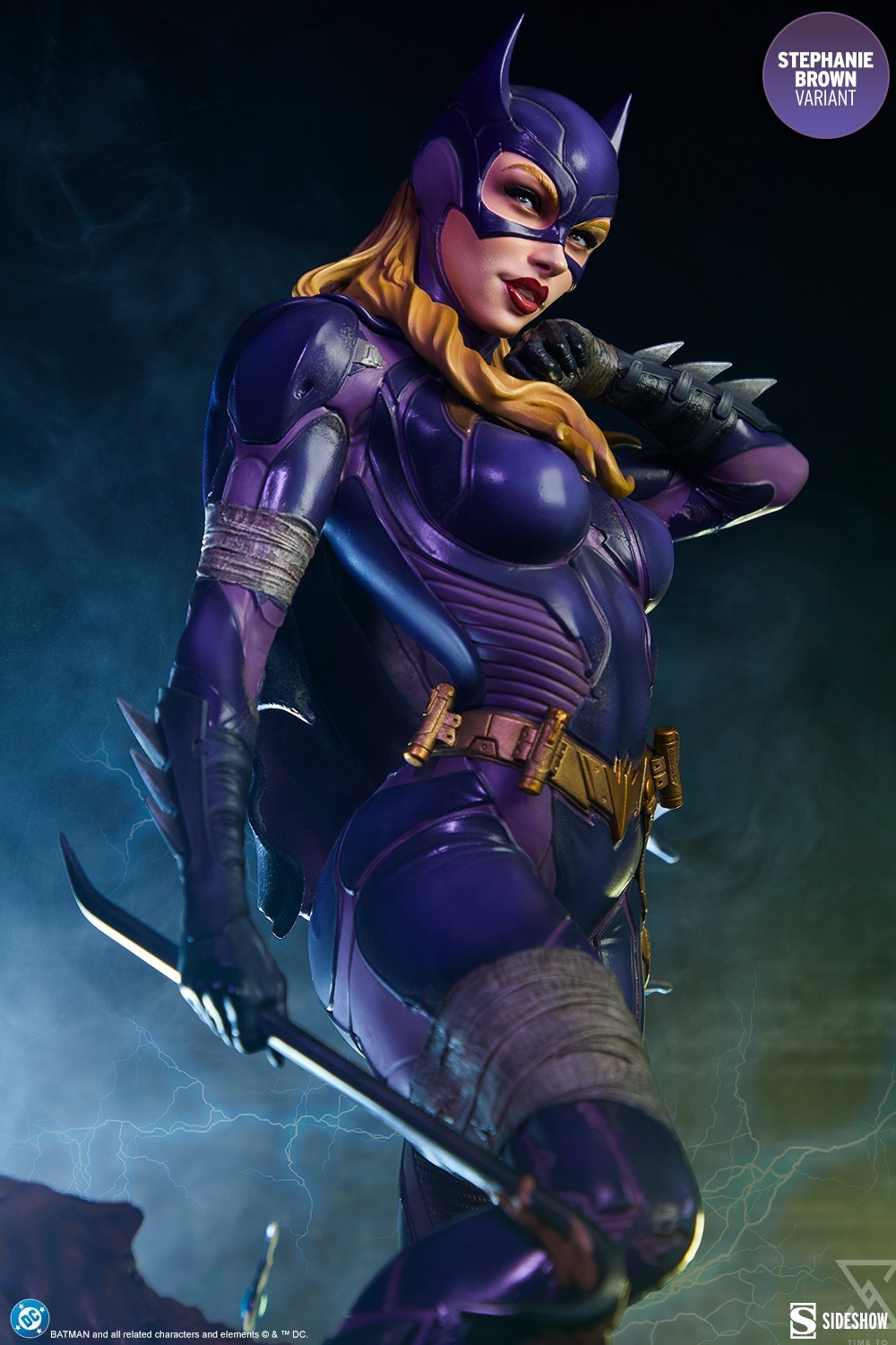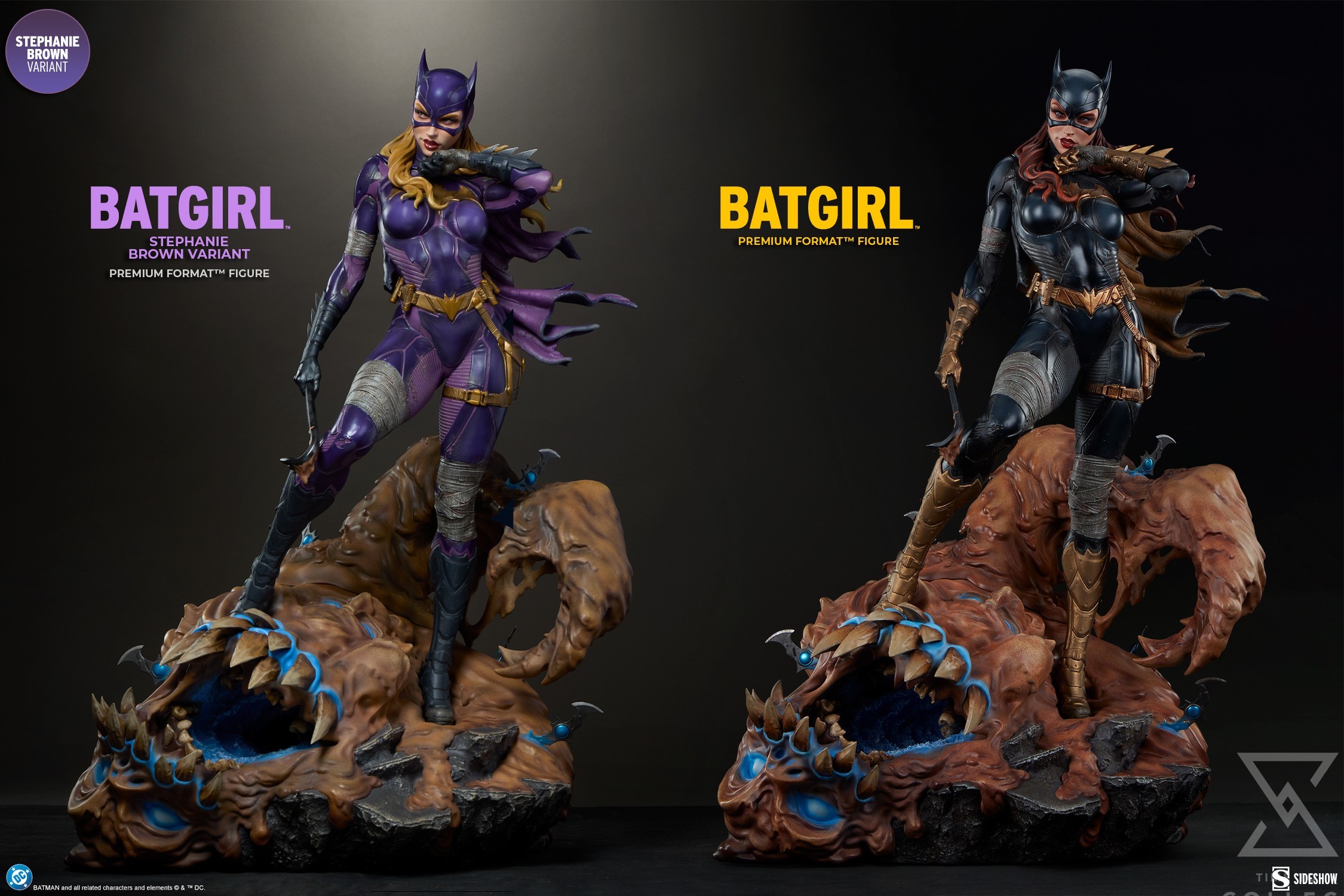 The polystone Batgirl (Stephanie Brown Variant) Premium Format™ Figure measures 21.5” tall x 15” wide x 14” deep. Inspired by the characters’ comic book appearances, this collectible is fully sculpted to capture everything from her costume details down to the varied textures of Clayface’s body. Cloth-like bandages wrap Batgirl’s arms and legs, while her tactical purple Batsuit is accented with armored gold elements like her gauntlets, boots, and utility belt. Her outfit is weathered to reflect the perils of crimefighting in Gotham City, and a tattered cape flutters off her shoulder. Below her, Clayface alternates between melting, muddy ooze and dried, cracked dirt where the Batarangs have zapped him.