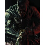 Choose your side in the war for Gotham City! Bring home the Batman #100 Fine Art Print by Lee Bermejo today.