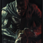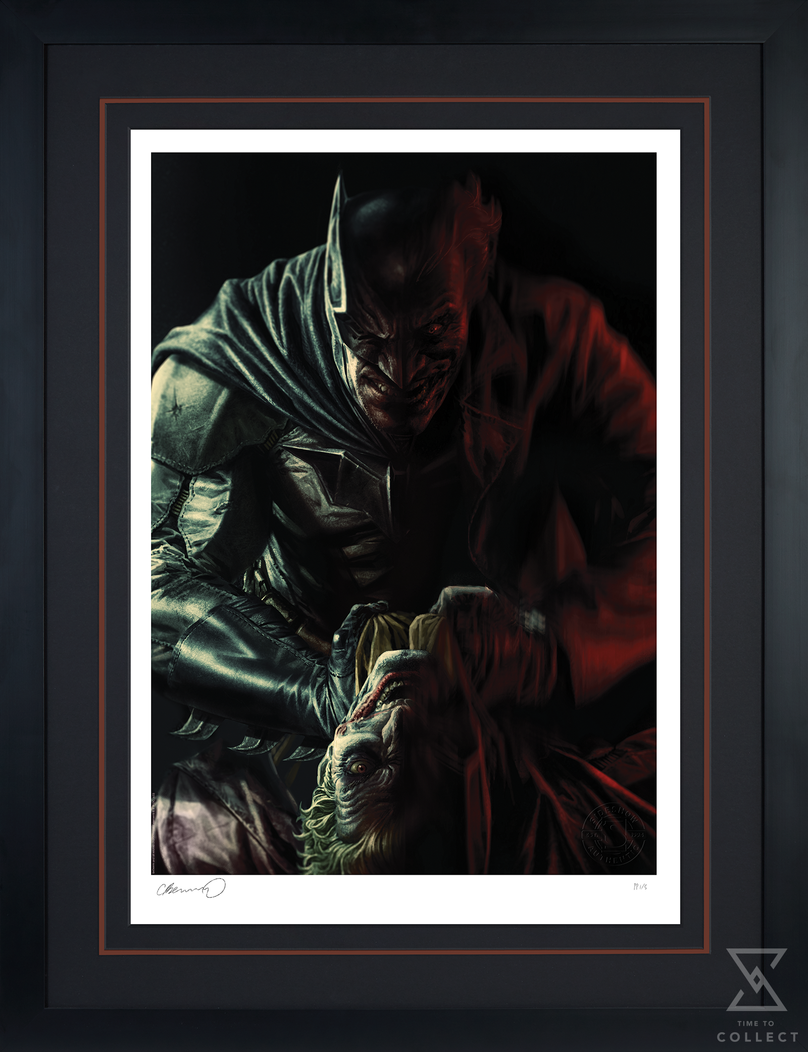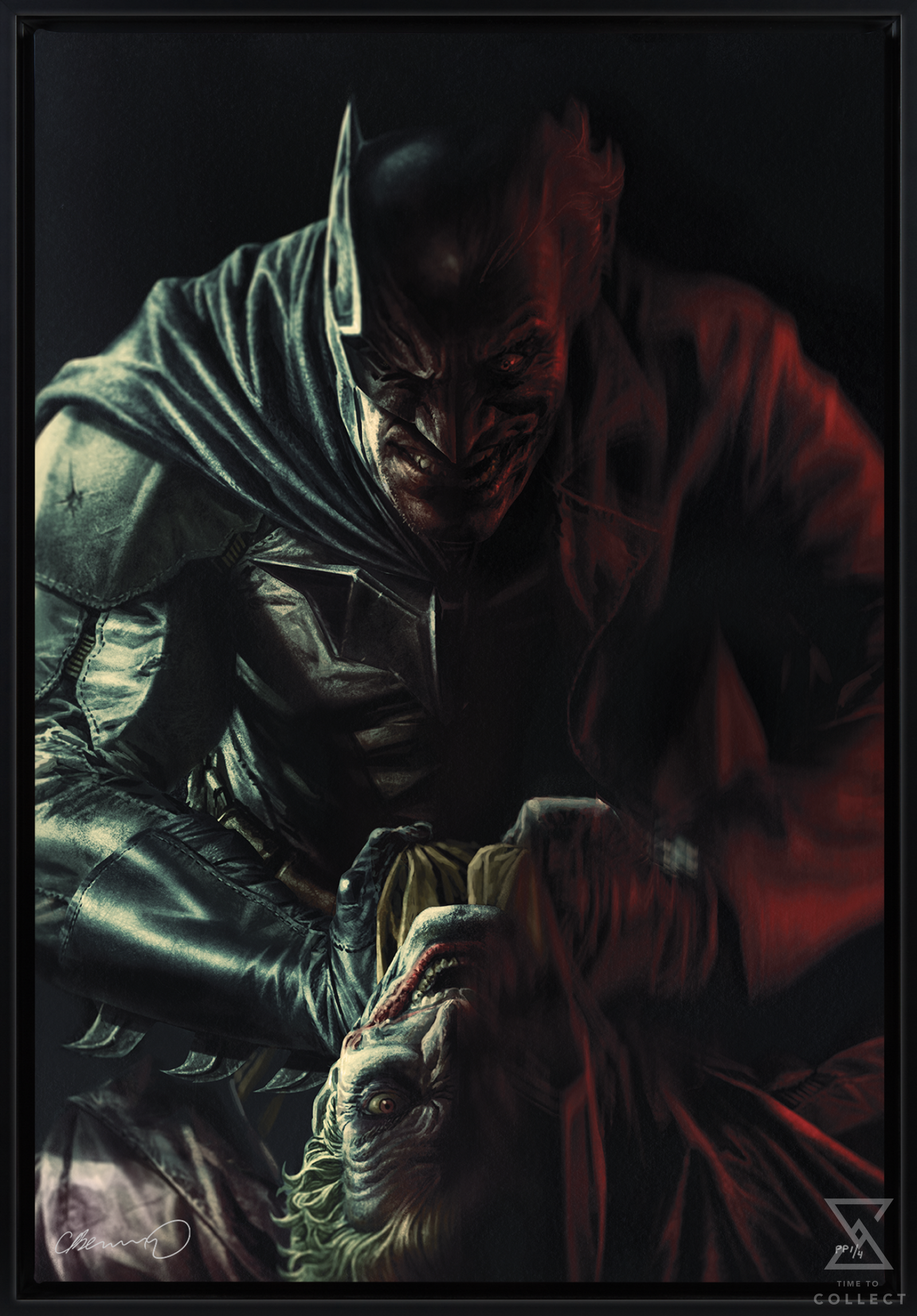 Batman and The Joker are diametrically opposed — like order and chaos, like justice and crime. And yet, there cannot be one without the other. Lee Bermejo’s spine-chilling portrait of the Dark Knight reveals the ways in which the two foes are forever a part of one another. As the Caped Crusader throttles his cackling adversary, the blood-red shadows reveal The Joker’s own smile creeping under Batman’s cowl. Like the mirrored figures of a playing card, they echo one another in their eternal duel for balance.