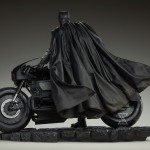 The Batman Premium Format Figure measures 19″ tall and 22″ wide as Batman, balanced with one foot on the rain-soaked black pavement, dismounts a sleek motorcycle which features functioning head and tail lights. Based on designs from The Batman, this fully realized black Batcycle stands steady and sturdy on two massive wheels beneath Batman. The hero’s mouth is set in its signature scowl, while his coiled body braces for the oncoming storm — whether it be a brutal battle or an emotional farewell.