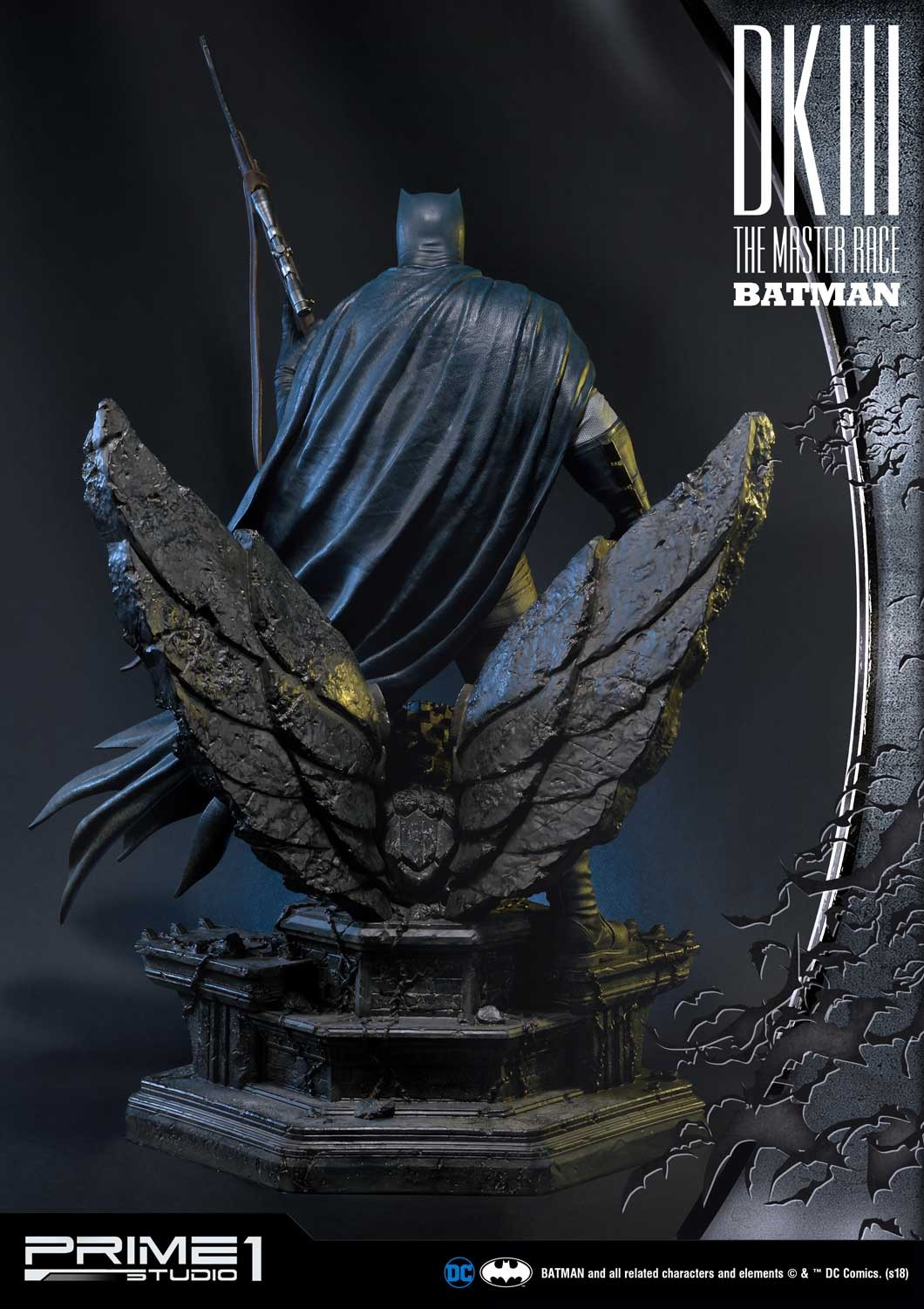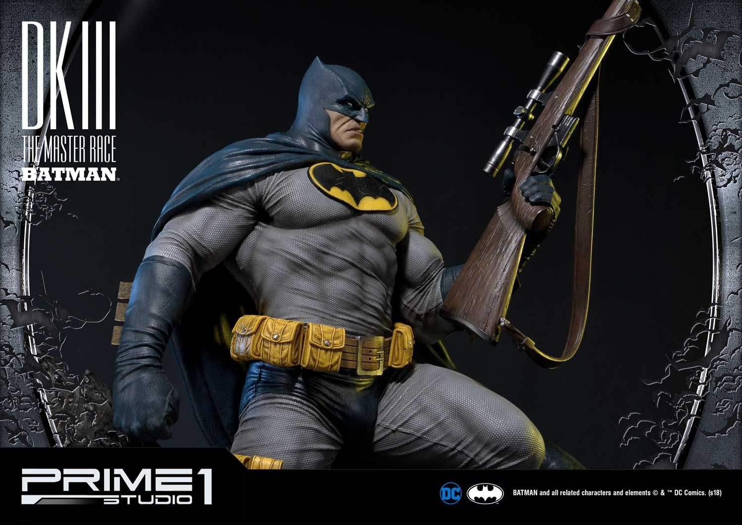 Prime 1 Studio is proud to present 1/3 scale MMDCDK3-01: Batman from The Dark Knight III: The Master Race. The Dark Knight III: The Master Race, also stylized as DK III: The Master Race, is a nine-issue DC Comics limited series co-written by Frank Miller and Brian Azzarello and illustrated by Miller, Andy Kubert and Klaus Janson. It has been 3 years since Batman was last active. In that time, most believe that he is gone or dead, rejecting the idea that he would ever come back. They were wrong. A photo of what appears to be Batman is taken, showing him mercilessly taking down cops who were going to shoot an unarmed boy. The media of course blows up, all that is talked about is the return of the Batman. The series is a sequel to Miller’s 1986 Batman miniseries, continuing the story of an aged Bruce Wayne resuming his identity as a crimefighter, aided by his sidekick Carrie Kelley (Robin) and featuring an ensemble of DC Universe characters including Superman, Green Lantern and Wonder Woman.