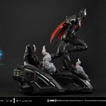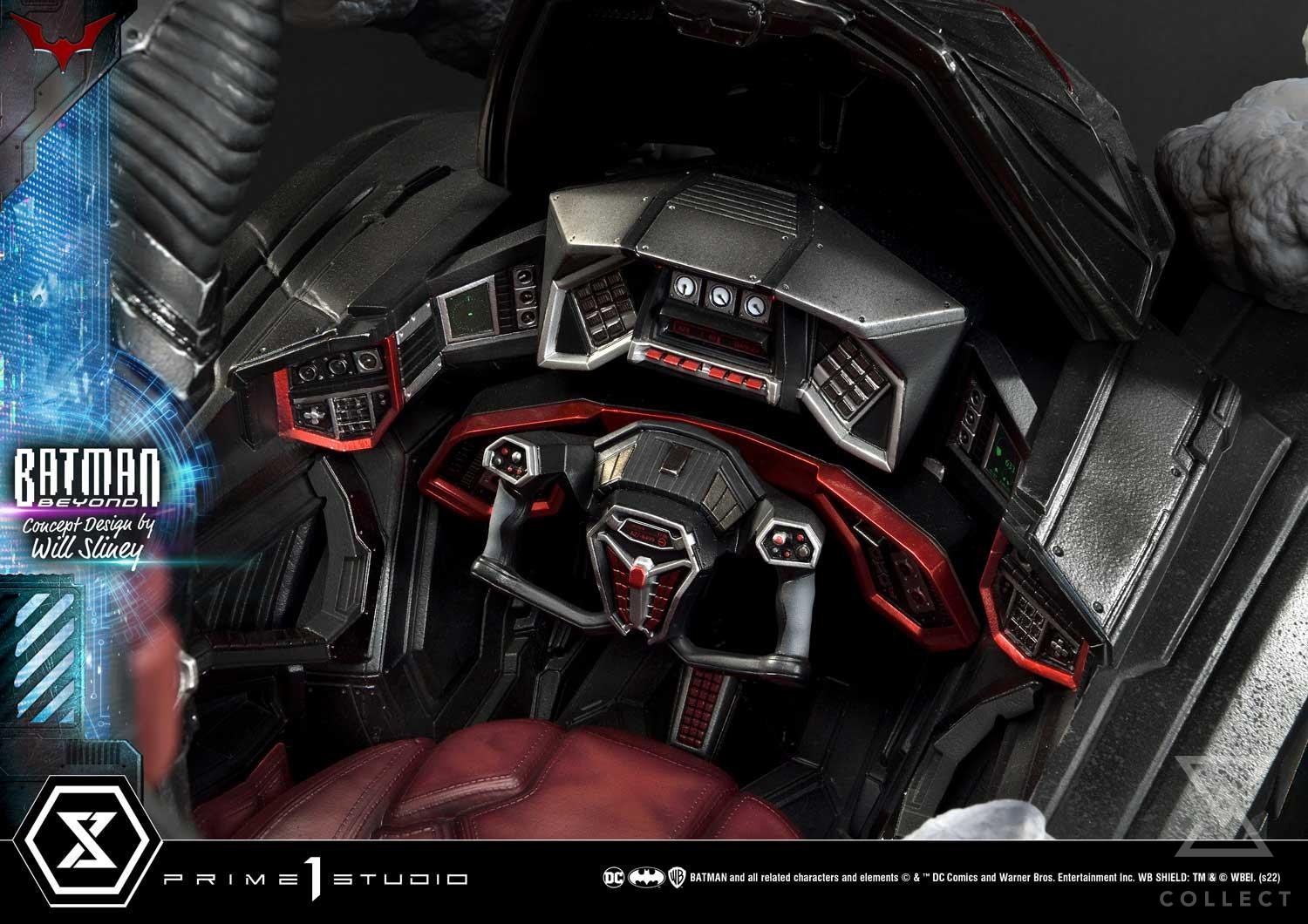 While the classic Batman Beyond design was iconic, beautiful, and perfect, our Prime 1 Studio artists endeavored to create a statue that demanded to be looked at. His whole suit features intricate, mech-inspired armor plating, from front to back, top to bottom. This Batman Beyond is full to the brim with complex detail. The armored bodysuit and wings are full of minute details. Intricate paneling, the hexagonal texture of the armor plates, and features that are clearly derived from his classic design are updated for a much more discerning and appreciative audience. Our artists at Prime 1 Studio have delivered a breathtaking sculpt that is painted equally to perfection. The ominous, black paint job of multiple finishes is punctuated with metallic red highlights to show off the complexity of Will’s design. And when you pre-order this Bonus Version from our official online store or any authorized distributor, you will receive a cool, extra Bonus Part: a swappable head with cool, red eyes! Batman Beyond is poised to exit his amazing futuristic, flying Batmobile. The small taste of the Batmobile cockpit and its complex array of instrument panels, a well-appointed flight chair, and high-tech controls was designed to amaze.