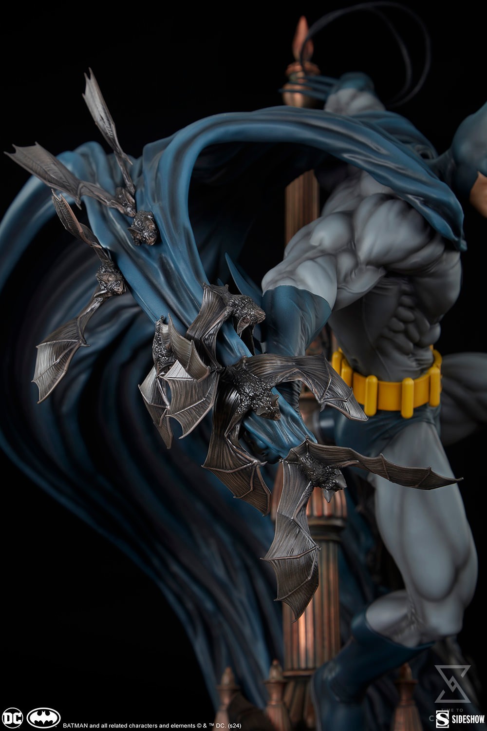 Measuring 27” tall, 21” wide, and 20” deep, the Batman Premium Format Figure finds Gotham City’s nocturnal super sleuth balanced at the summit of a church steeple. Bruce Wayne’s alter ego searches for clues to help him solve his current case while he grapples onto a crooked spire far above the city streets. As a colony of bats swarms around and morphs into his long, billowing cape, Batman becomes a prowling creature of the night who is able to stalk any enemy through the deepest shadows and the most dizzying heights.