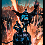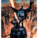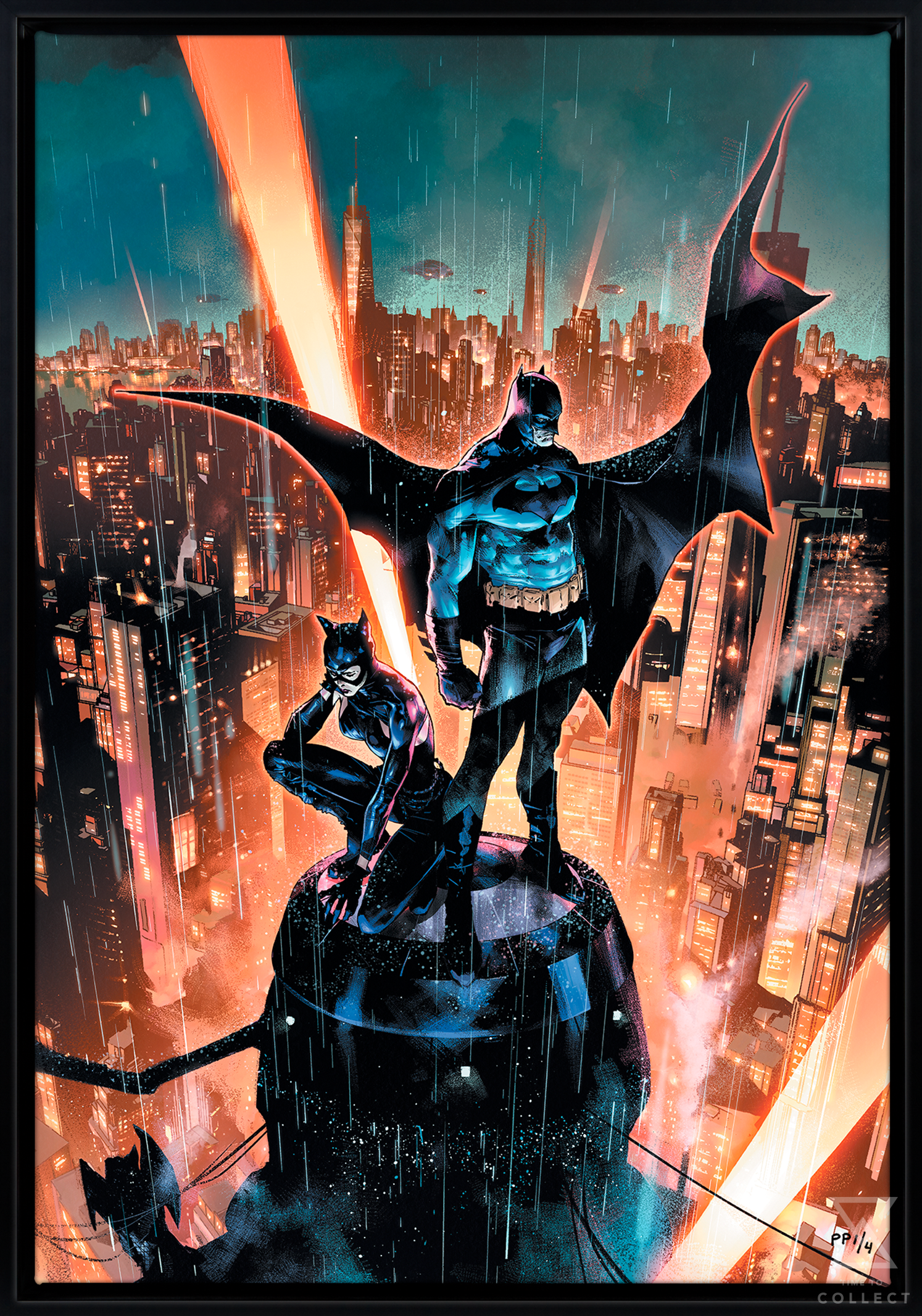 The Bat and The Cat are on the hunt! Bruce Wayne and Selina Kyle rendezvous far above Gotham City while evening rain falls. Below, warm orange light shines in defiance of the dark. Braving the downpour, both heroes are dressed for a romantic night of vigilantism. Their angular silhouettes and drifting attention, however, reveal that this crime-fighting couple may be keeping more secrets than they’re sharing.