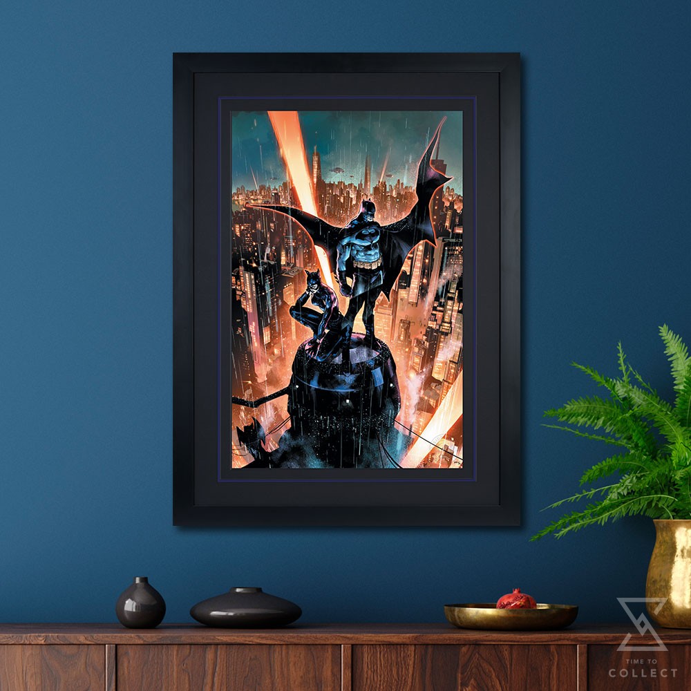 Originally created as a cover for Batman Vol. 3 #90 (2020), written by James Tynion IV for DC Comics, this Batman art is now available to fans as an unframed giclée or in a custom framed presentation. Each Batman & Catwoman Fine Art Print features an embossed Sideshow Seal of Authenticity as part of the limited edition of 250 pieces.