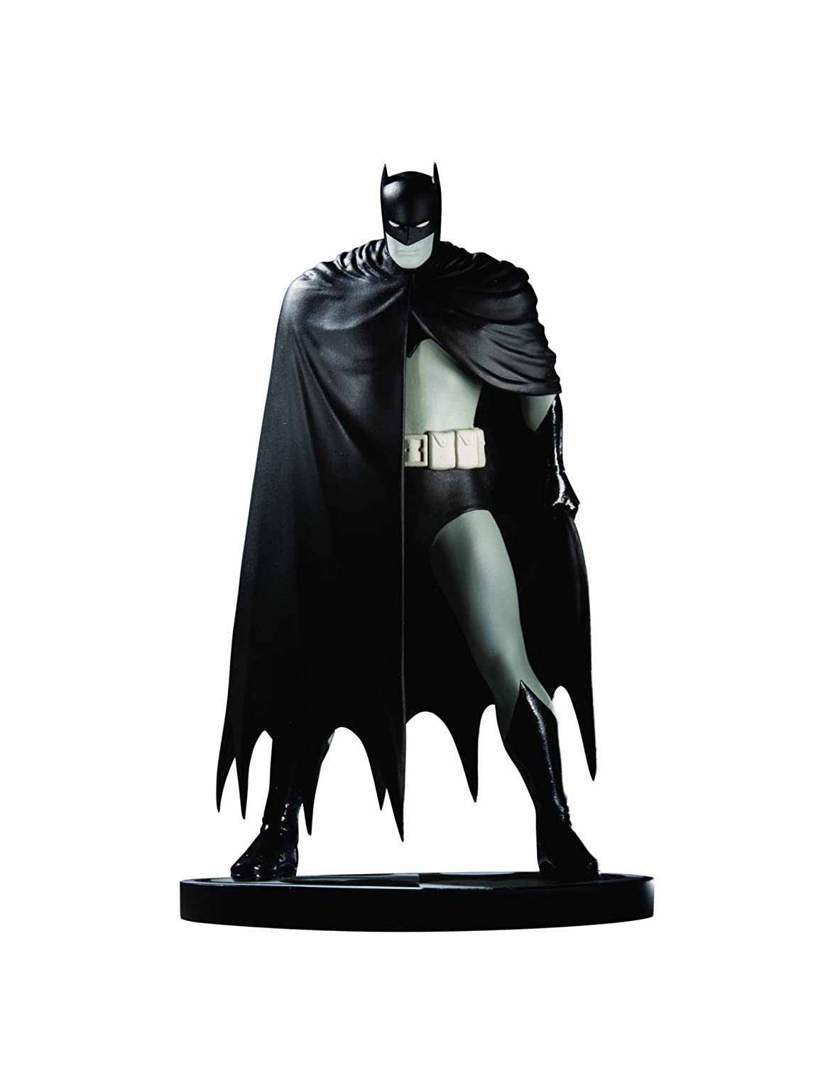 The statue measures approximately 7.75″ high x 4.5″ wide x 2.75″ deep, is painted in monochromatic tones, features a Bat-logo-shaped base and is packaged in a black and white box.