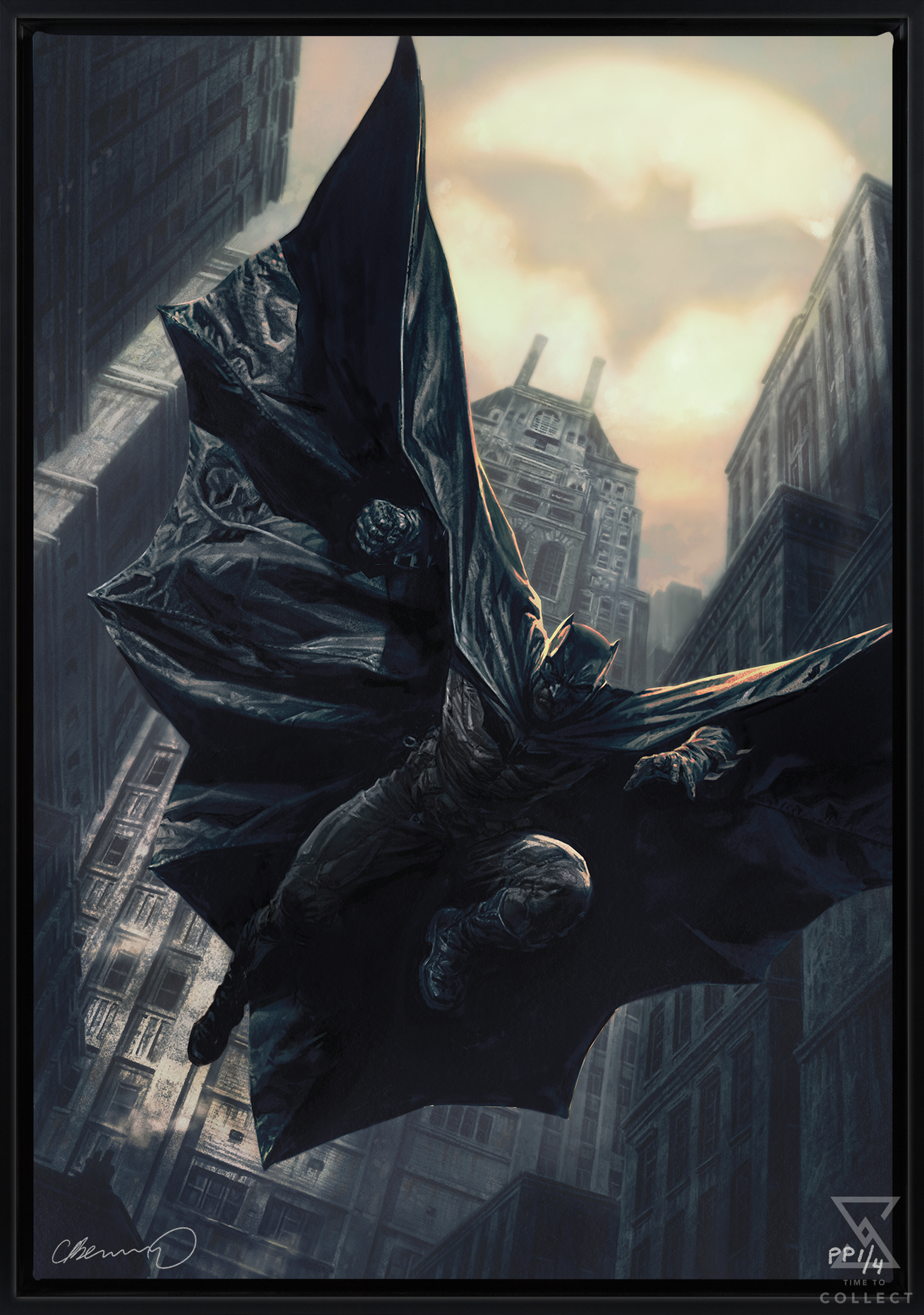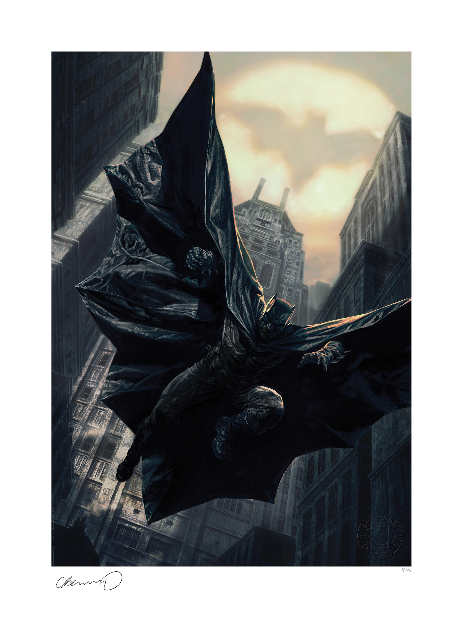 Originally created as a variant cover for Detective Comics #1019 (2020), written by Peter J. Tomasi for DC Comics, this comic book artwork is now available for fans in a fine art format. Each Batman Descent on Gotham: Detective Comics #1019 Fine Art Print features an authorized, automated artist signature and an embossed Seal of Authenticity as a part of the limited edition of 150 pieces. Available as an unframed giclée or in a custom framed presentation, this Batman wall art makes a grim addition to any fan’s collection.