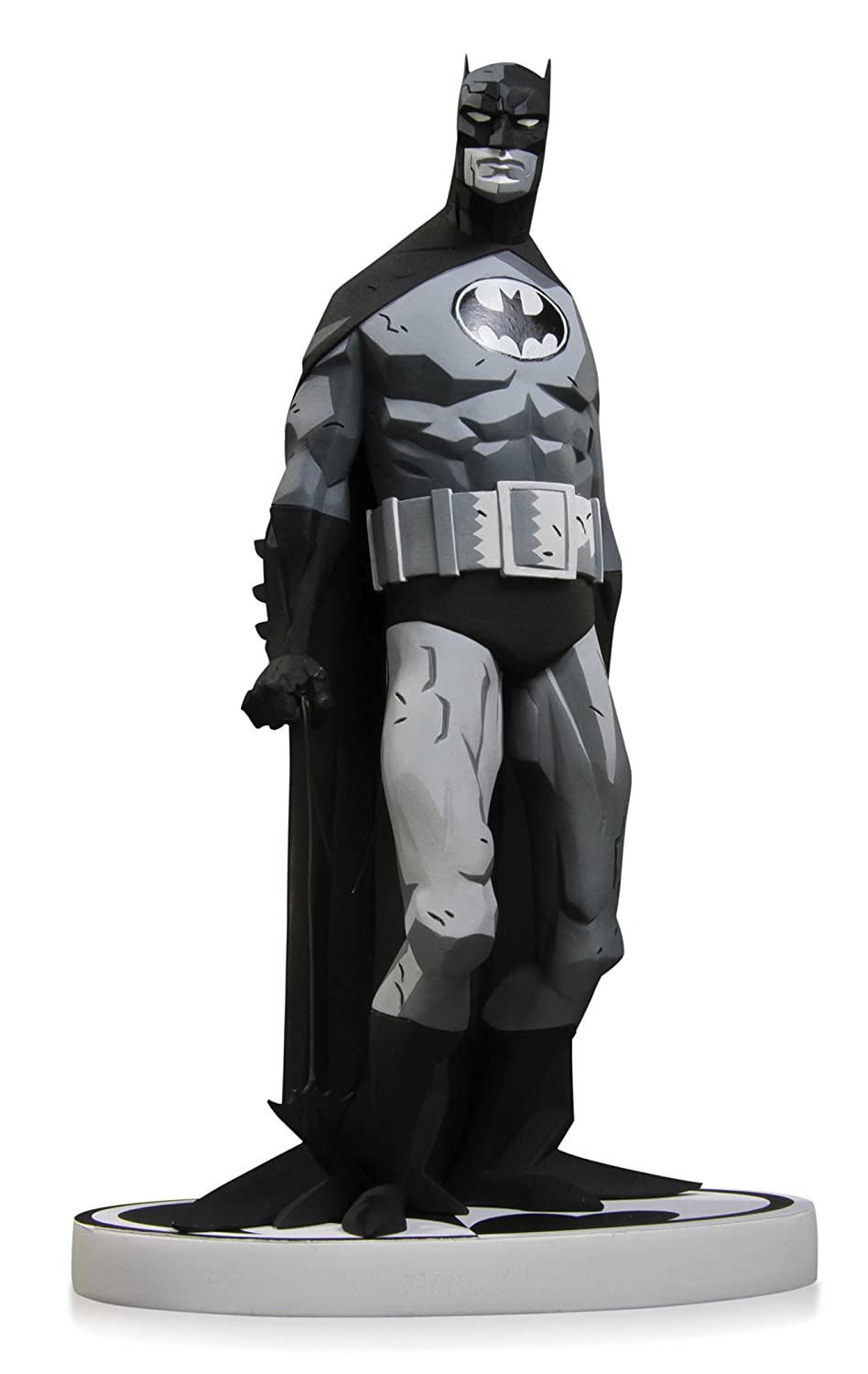 Designed by Hellboy creator Mike Mignola and cold cast in porcelain, the limited edition sculpture measures approximately 7 1/2-inches tall x 4 3/4-inches wide x 3-inches long, is painted in monochromatic tones, features a Bat-logo-shaped base, and comes packaged in a black-and-white box.