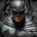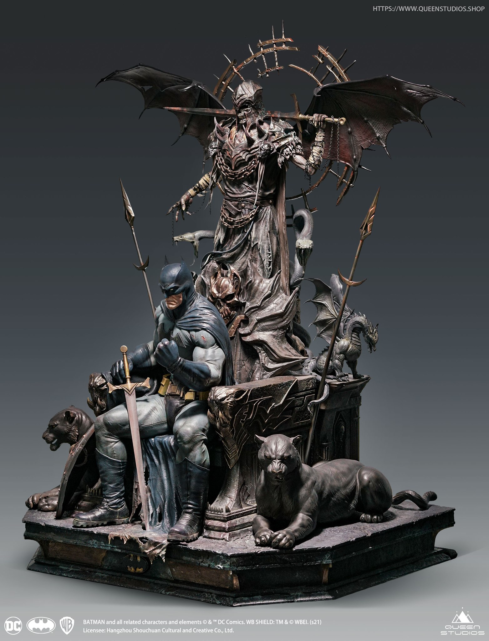 Crafted with incredible detail. This Batman on Throne 1/4 scale statue depicts the Caped Crusader facing forward. A sword is resting on his right leg, he is holding its hilt with his right hand. His left hand is grabbing the air, as if he wants to enact revenge. On either side of the Bat, two panthers lay,behind them are spears. The Bat is shrouded by an ominous figure, one who looks tempted to take something away from the Batman.