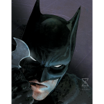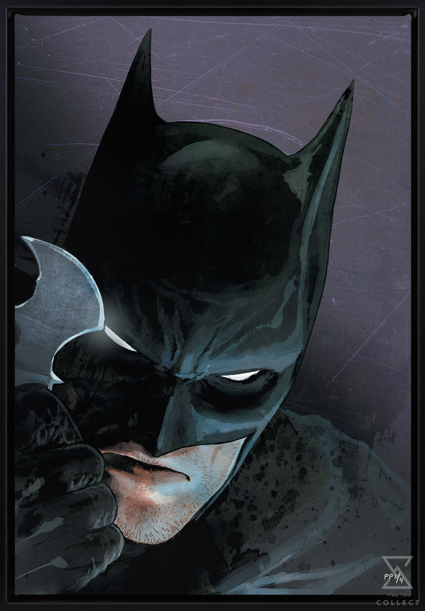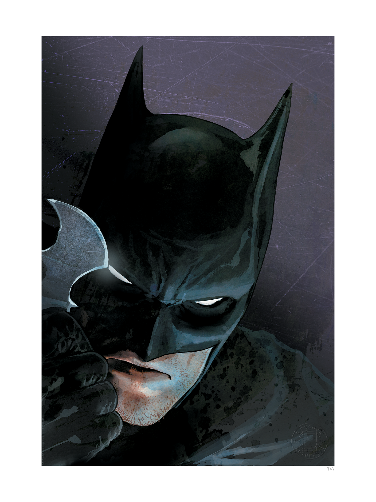 The Batman: Rebirth Fine Art Print explores the Dark Knight’s duality in an intense portrait. A living extension of the darkness, Batman emerges from the shadows wearing a deep black cowl, cape, and gloves. He wields a shining silver Batarang — a symbol of hope to many, but a symbol of fear to every evildoer in Gotham City.