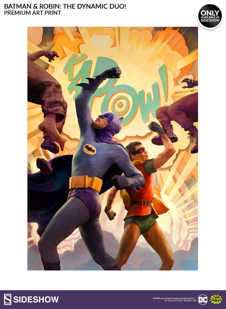 SIDESHOW IS PROUD TO PRESENT BATMAN AND ROBIN: THE DYNAMIC DUO! PREMIUM ART PRINT BY JON FOSTER CELEBRATING THE 50TH ANNIVERSARY OF THE BELOVED CLASSIC ‘60S BATMAN TELEVISION SERIES. FEATURING ADAM WEST AND BURT WARD TAKING OUT BAD GUYS AS THE HEROIC CAPED CRUSADER AND HIS TRUSTY SIDEKICK, THIS VIBRANT, OFFICIALLY LICENSED AND LIMITED EDITION ART IS THE PERFECT ADDITION TO ANY CLASSIC BATMAN COLLECTION!