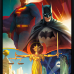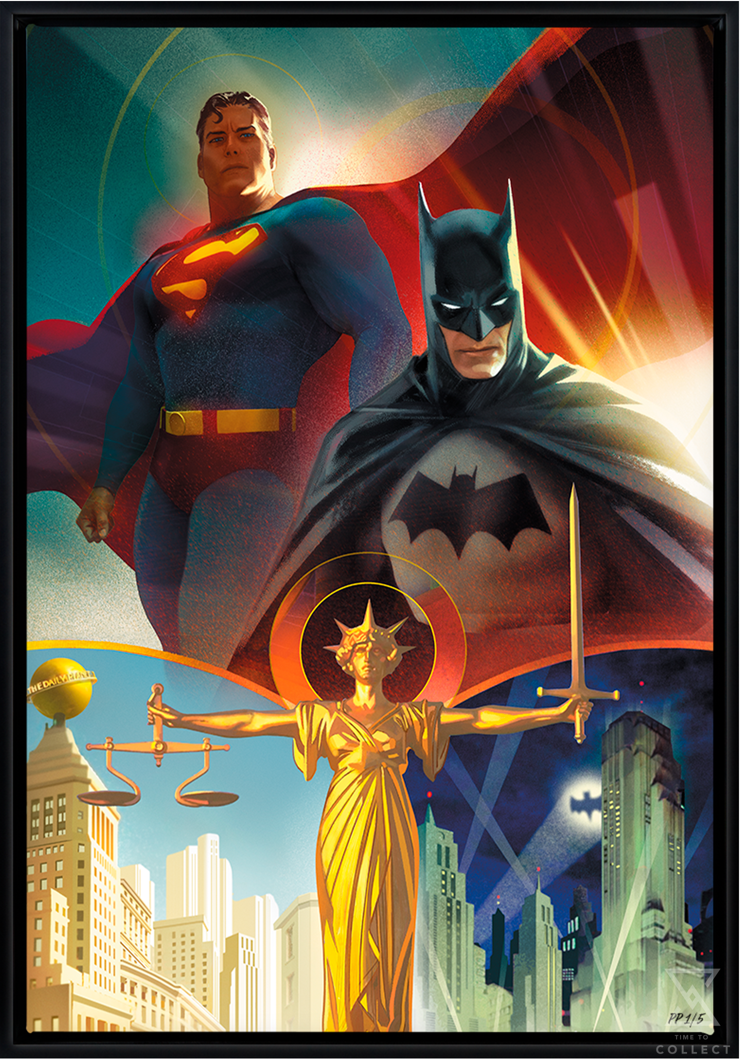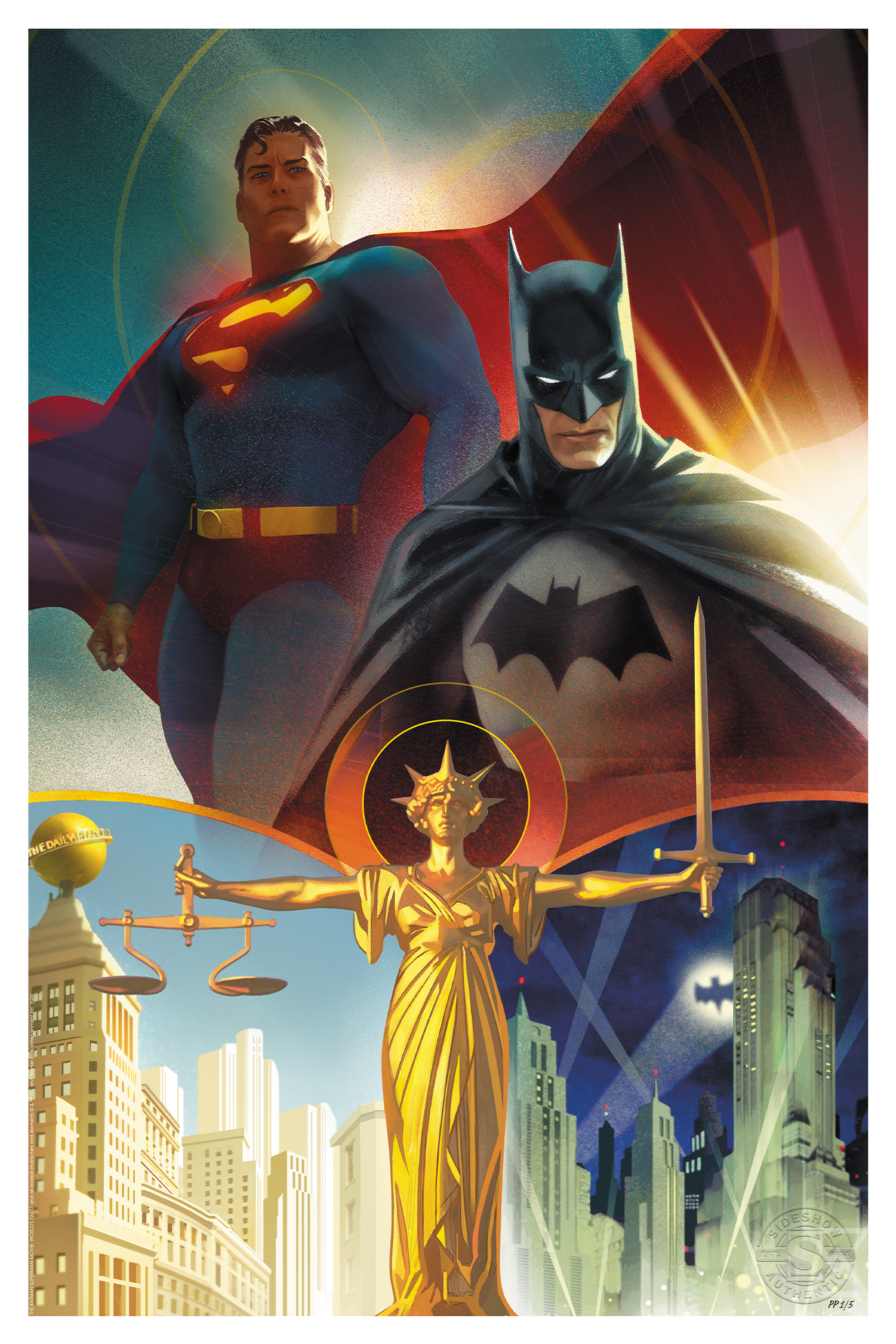 Golden light shines upon The World’s Greatest Detective and The Last Son of Krypton while they stand as stalwart protectors of the places they call home. Beneath Batman is a nighttime view of Gotham lit by searchlights and the Bat-Signal. Beneath Superman rises Metropolis, with the sunny scene featuring Clark Kent’s daytime workplace, the Daily Planet. In the center, Lady Justice broaches the boundaries between the two cities as a pillar of these heroes’ shared beliefs.