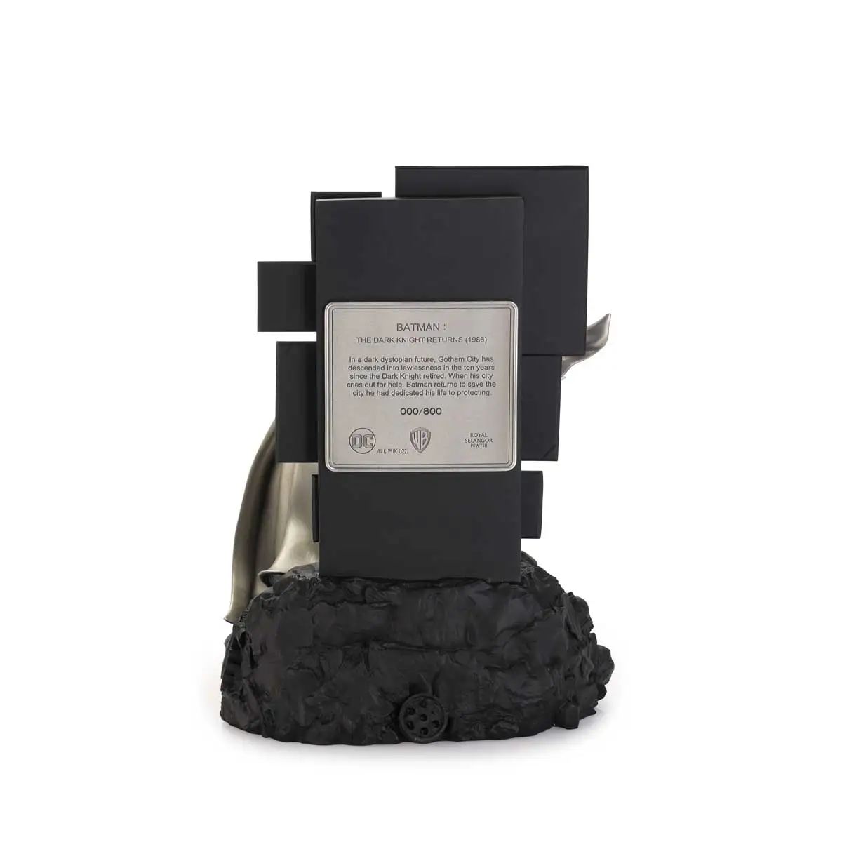 The Dark Knight Returns sees a retired Batman don the cape once more to fight crime in Gotham City, only to find himself facing his one-time ally Superman in a battle only one will walk away from. Illustrator Alan Quah and sculptor Mufizal Mokhtar’s superb rendition portrays the heavily armoured title character in Frank Miller’s unmistakeable style, standing against cells from the comic book. In pewter and composite resin.