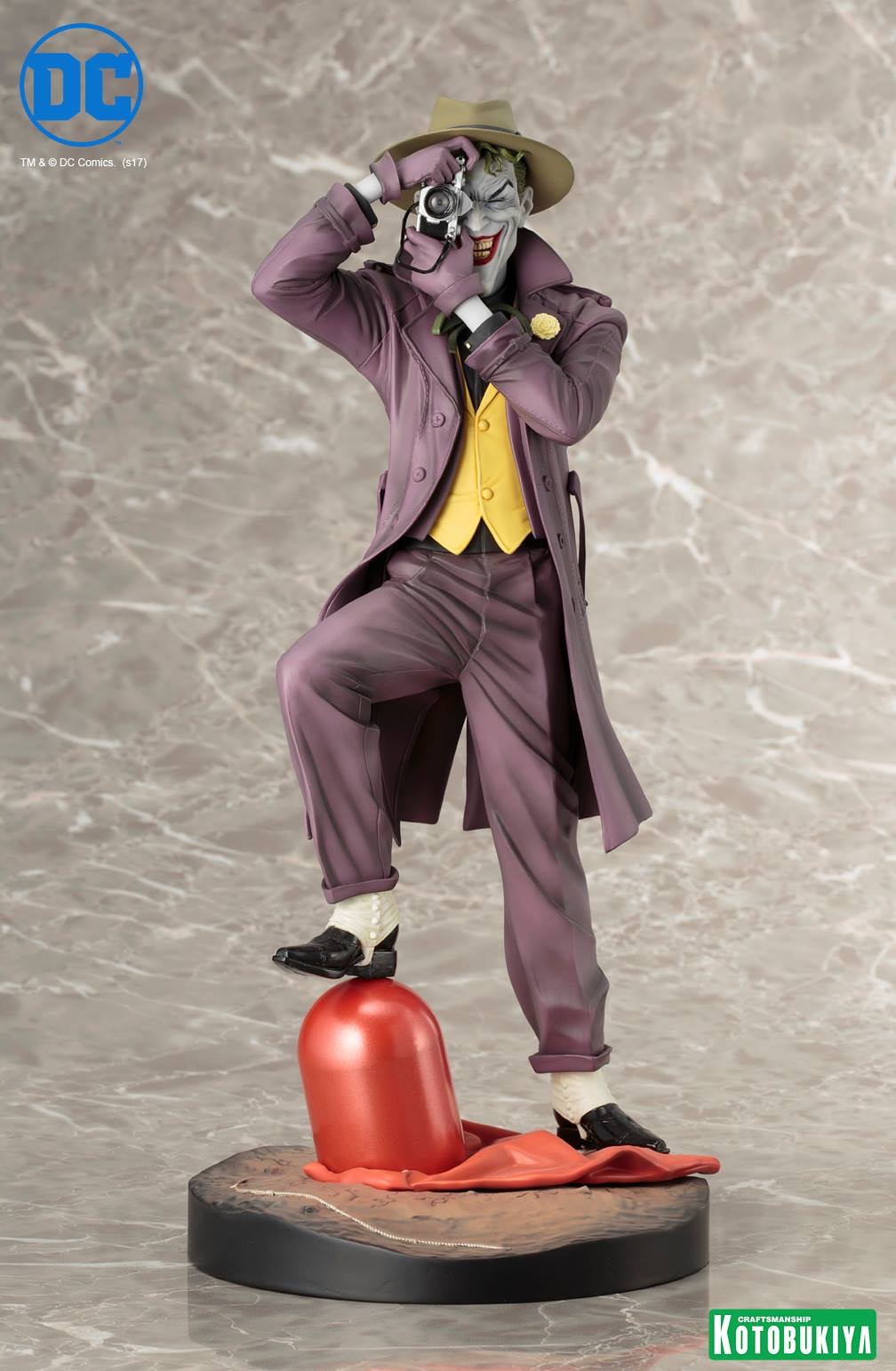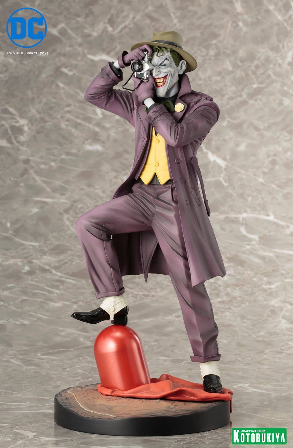 Featuring a portrait inspired by the graphic novel cover art coupled with an original pose by Kotobukiya, this statue brings the maniacal clown to life that’s sure to please any DC Comics reader. In this new edition Joker stands on the helmet and cape of the original Red Hood, smiling his huge toothy grin as he snaps a photo on his old school film camera. The sadistic villain’s costume is incredibly detailed, showing off every seam, cuff, button, crease, and more on his purple three piece suit and trench coat. His outfit is even topped off by authentic studded spats, fedora, iconic white gloves, and lapel-pinned flower. The Joker’s elongated white painted face leaps right off of the graphic novel cover with its deep laugh lines, left eye squeezed shut, and unruly green hair peeking out from under his hat. This 2nd Edition does not include the original light-up gimmick, but Joker fans will love the subtle nod to one the villain’s alter ego’s literally at his feet!