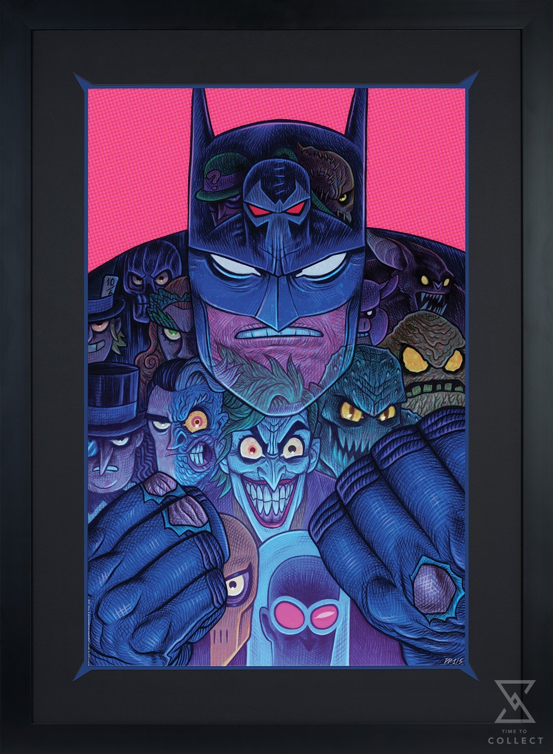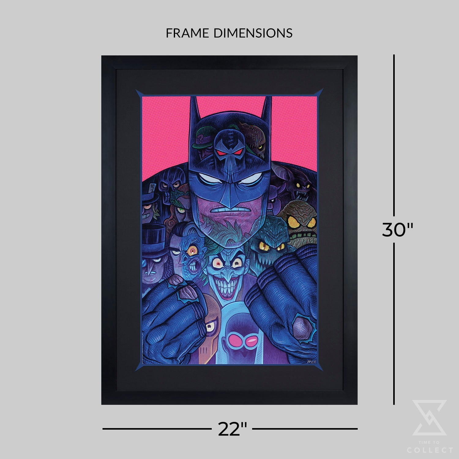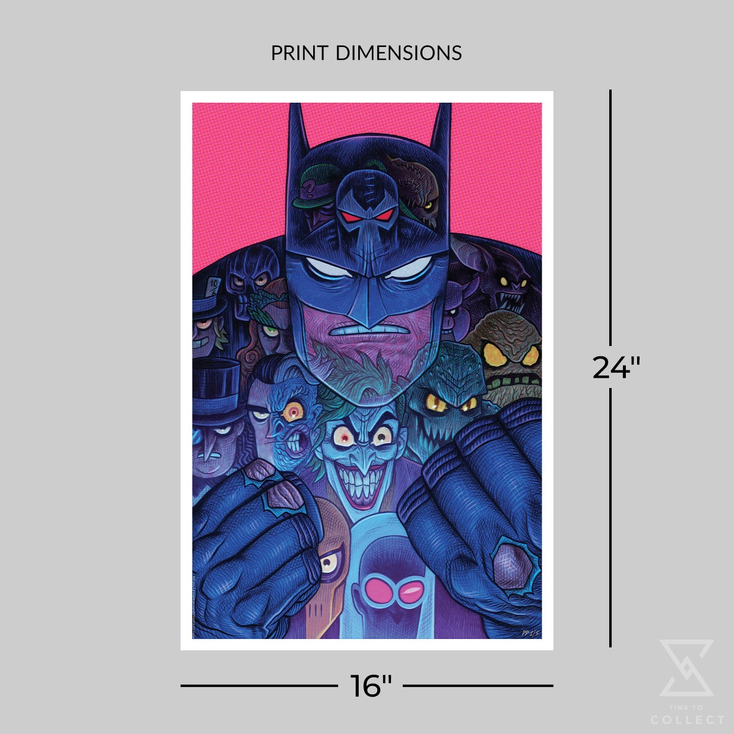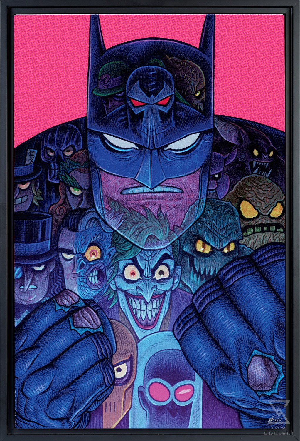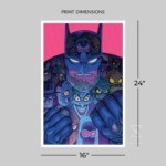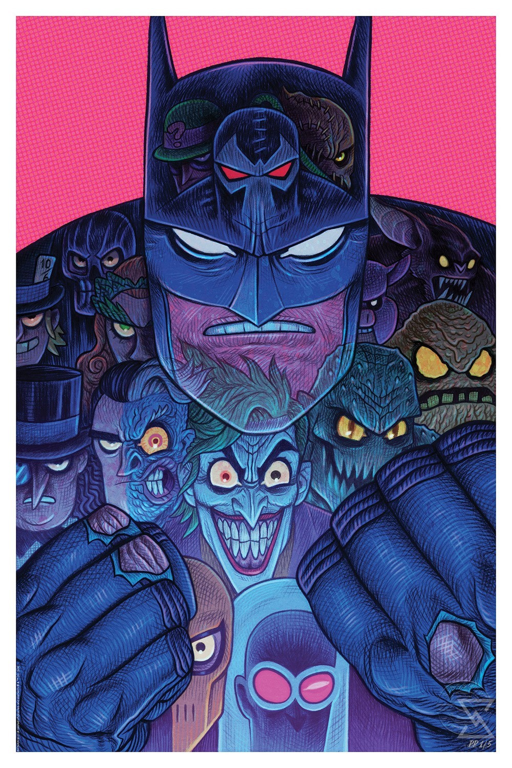 A hero is only as good as his villains, and Batman has plenty of excellent enemies! In this stylized illustration, the Dark Knight squares up to go another round against thirteen of Gotham City’s most notorious villains. Riddler, Bane, Scarecrow, Black Mask, Mad Hatter, Poison Ivy, Professor Pyg, Man-Bat, Penguin, Two-Face, The Joker, Killer Croc, and Clayface have found their calling as Batman’s favorite foes. But are these antagonists simply hidden within his cape and cowl, or are they a reflection of the vigilante beneath?