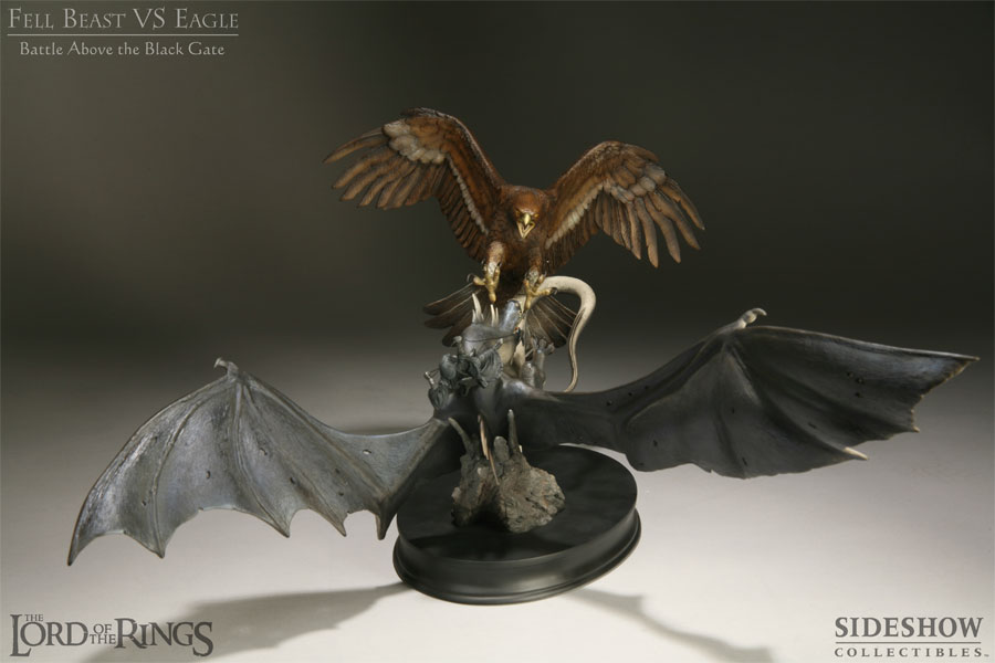 Sideshow Collectibles and New Line Cinema are proud to bring you the latest entry in the series of The Lord of the Rings Dioramas, Fell Beast VS Eagle. In this dynamic diorama from Return of the King, the creatures of Middle-earth are locked in battle, fighting the War of the Ring in the skies. The diorama is immense, with the fell beast’s wingspan stretching to twenty-two inches. Each piece is cast in high quality polystone, hand-finished, and hand-painted to exacting standards. The Fell Beast VS Eagle Diorama is complete with a hand-numbered individual edition number on the bottom side of the base. Don’t miss this chance to continue your collection of The Lord of the Rings Dioramas!